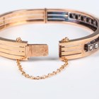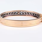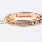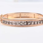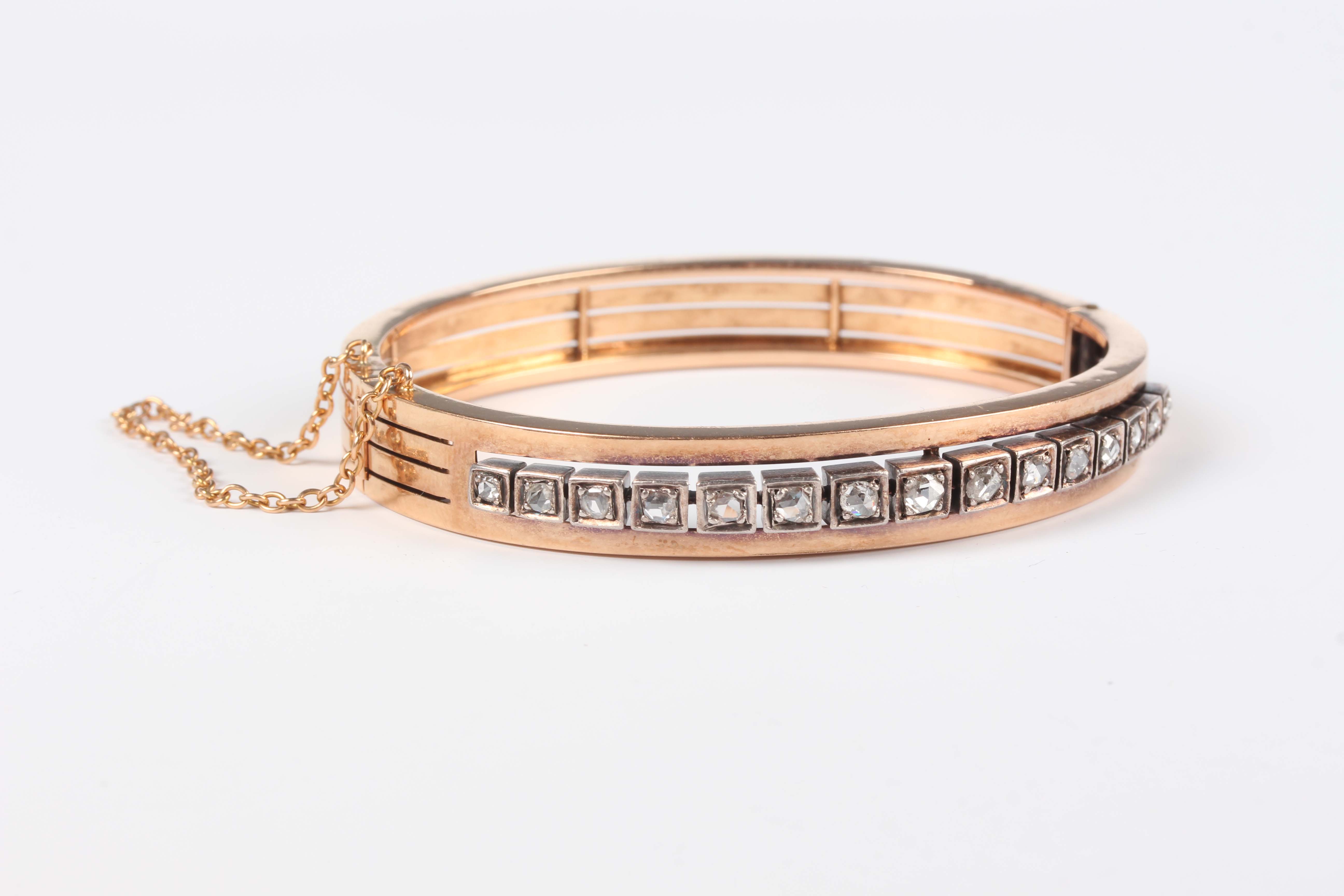 A French gold, silver set and diamond oval hinged bangle, the front mounted with a row of rose cut diamonds, each within a square shaped setting, on a snap clasp, French marks to clasp, weight 19.7g, inside width 5.7cm.
