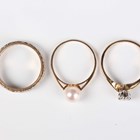 A 9ct gold ring, mounted with a cultured pearl, ring size approx L, a 9ct gold and diamond single stone ring in a twistover design, detailed ‘.15’, ring size approx L1/2, and a 9ct two colour gold and colourless gem set full eternity ring, total weight 5.7g.
