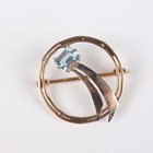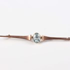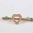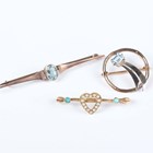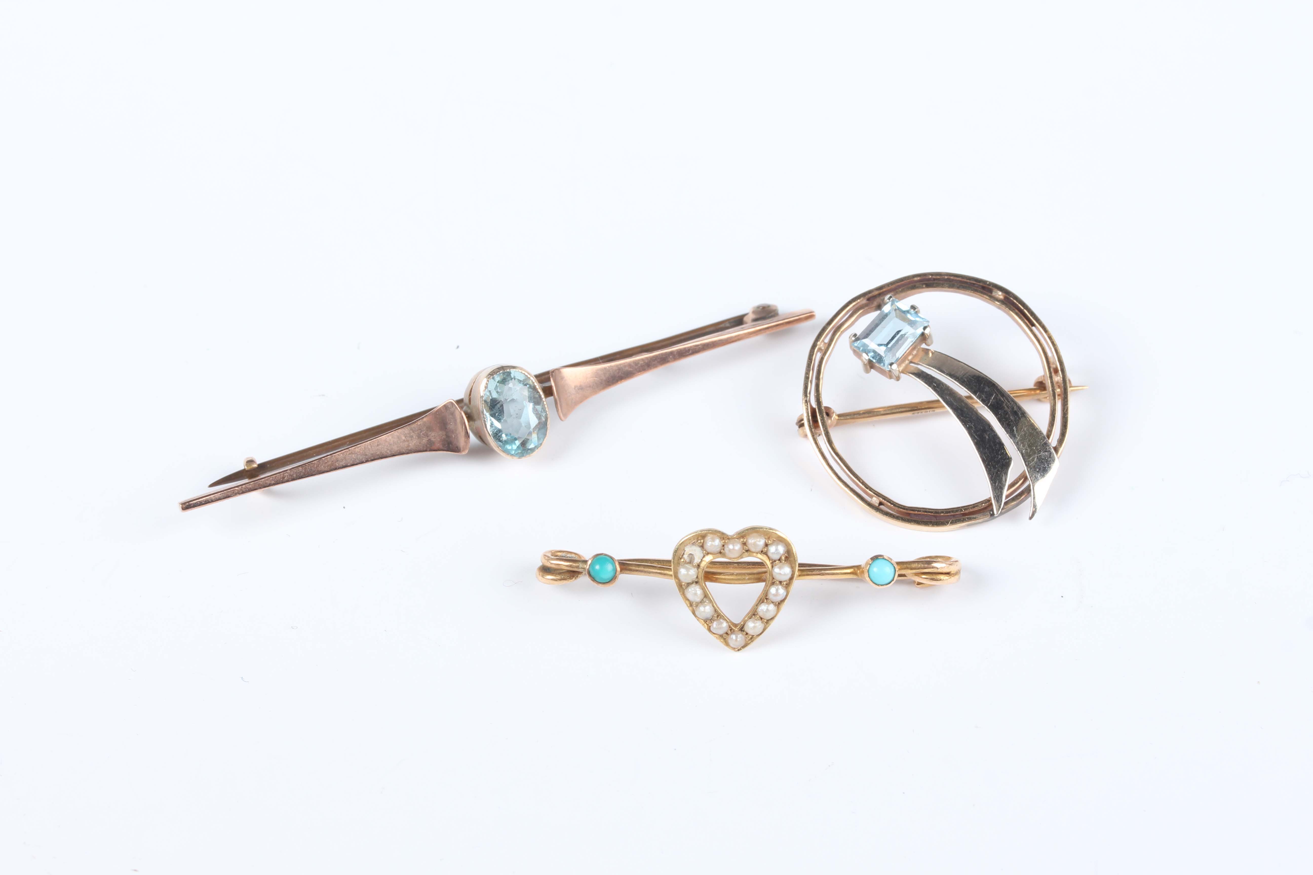 A 9ct gold shaped circular brooch, mounted with a cut cornered rectangular aquamarine, weight 2.2g, width 2.2cm, a gold bar brooch, collet set with an oval cut aquamarine, unmarked, weight 1.9g, and a gold, turquoise and seed pearl brooch, the centre with a heart motif, indistinct mark, weight 1.8g.