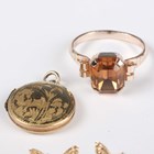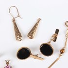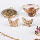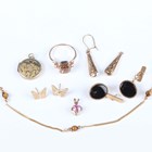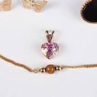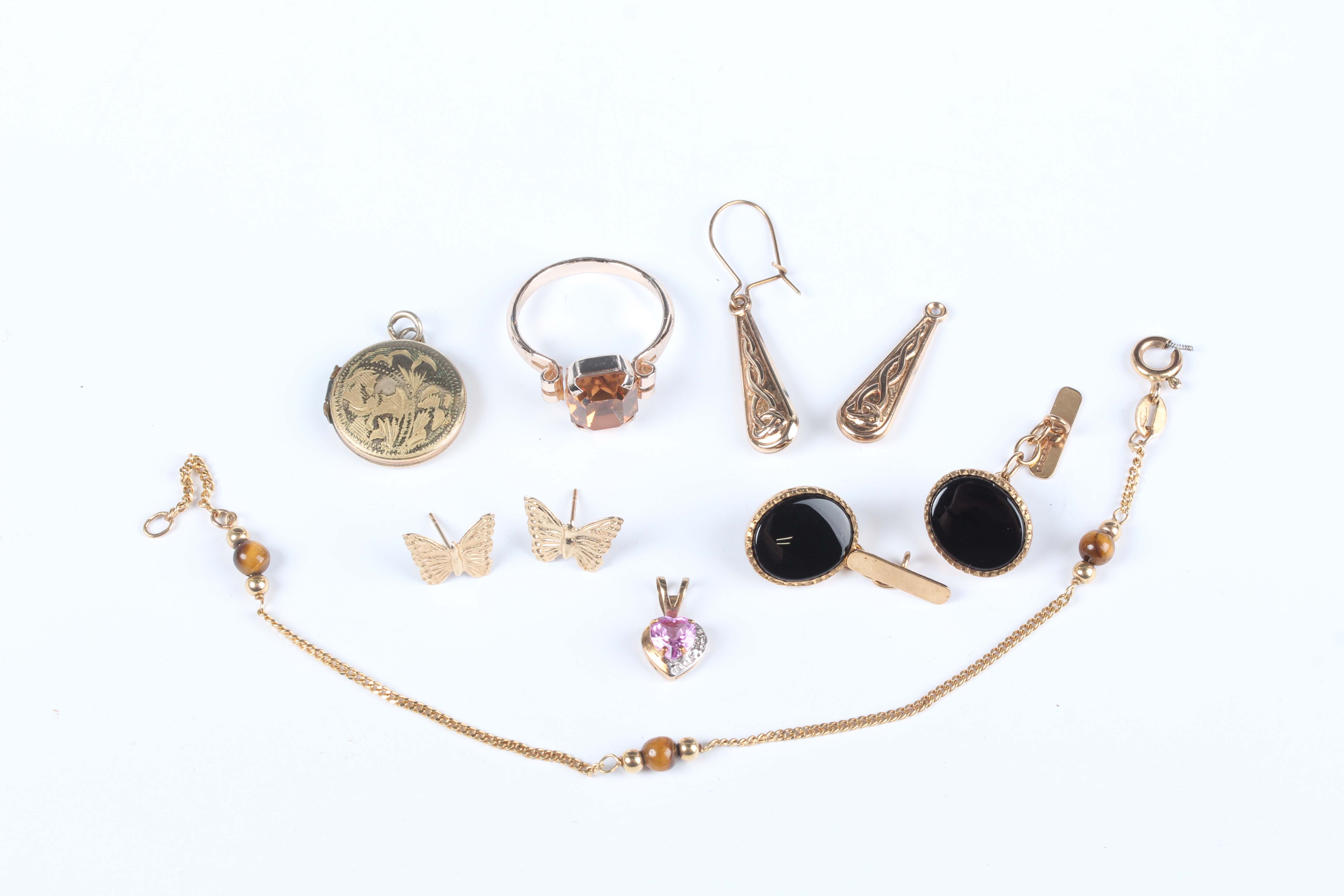 A pair of 9ct gold and black onyx oval cufflinks with bar backs, dimensions of each front 1.4cm x 1.2cm, a 9ct gold, pink sapphire and diamond heart shaped pendant, a 9ct gold and tiger's eye bracelet, total weight 5.6g, two pairs of gold earrings, both unmarked, total weight 0.7g (one top lacking), and two further items.