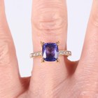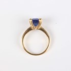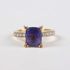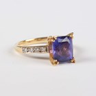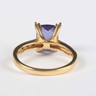 An 18ct gold, tanzanite and diamond ring, claw set with the cushion shaped tanzanite between diamond four stone shoulders, Birmingham 2005, weight 4.9g, tanzanite weight approx 2.50-2.80ct, ring size approx N.