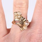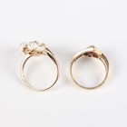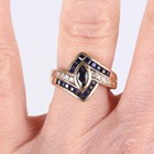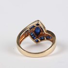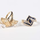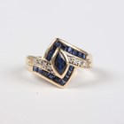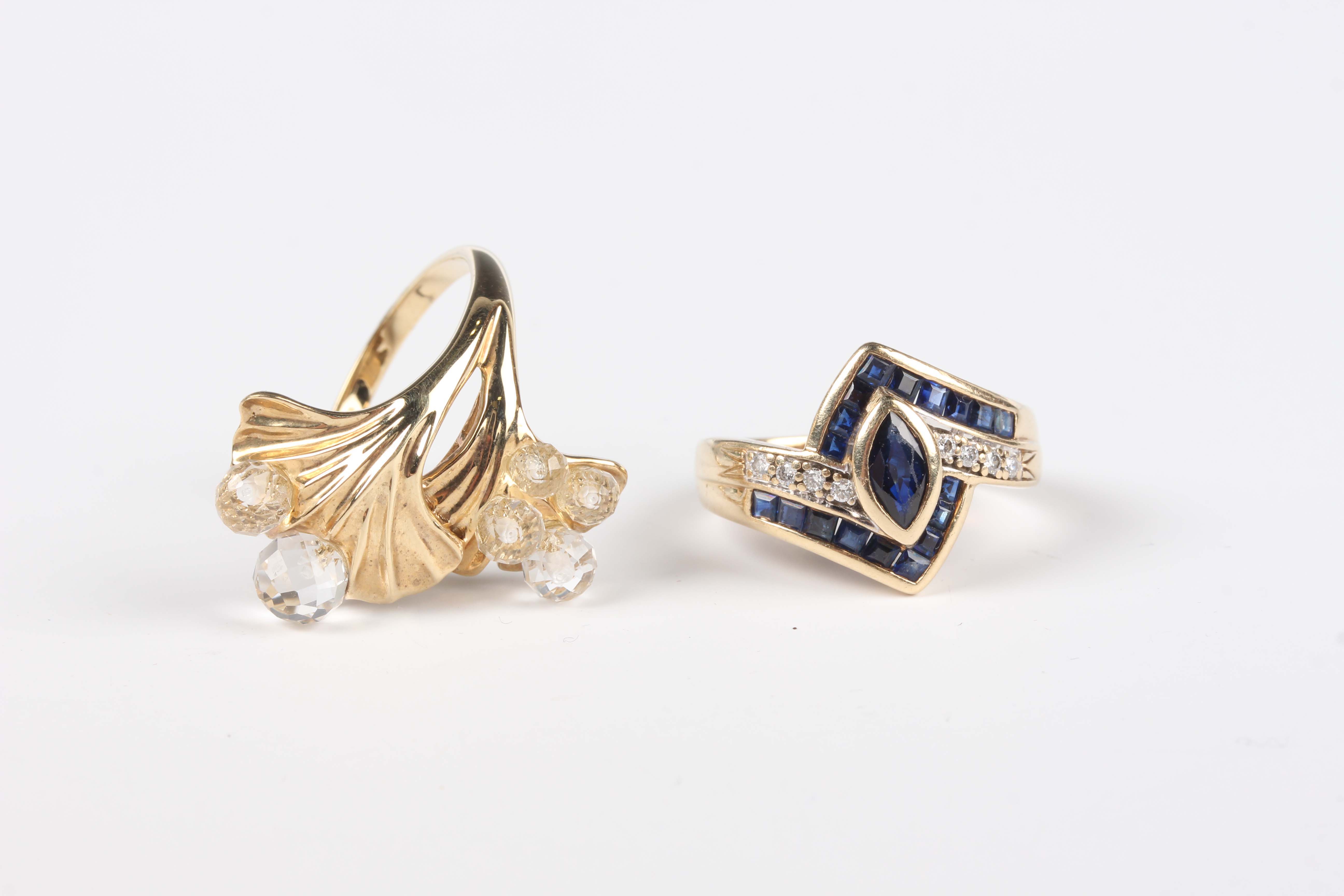 A 9ct gold, treated sapphire and diamond marquise shaped ring in a twist design, ring size approx M, and a 9ct gold and colourless gem set ring in a twistover spray design, ring size approx N, total weight 7.8g.