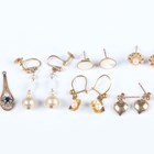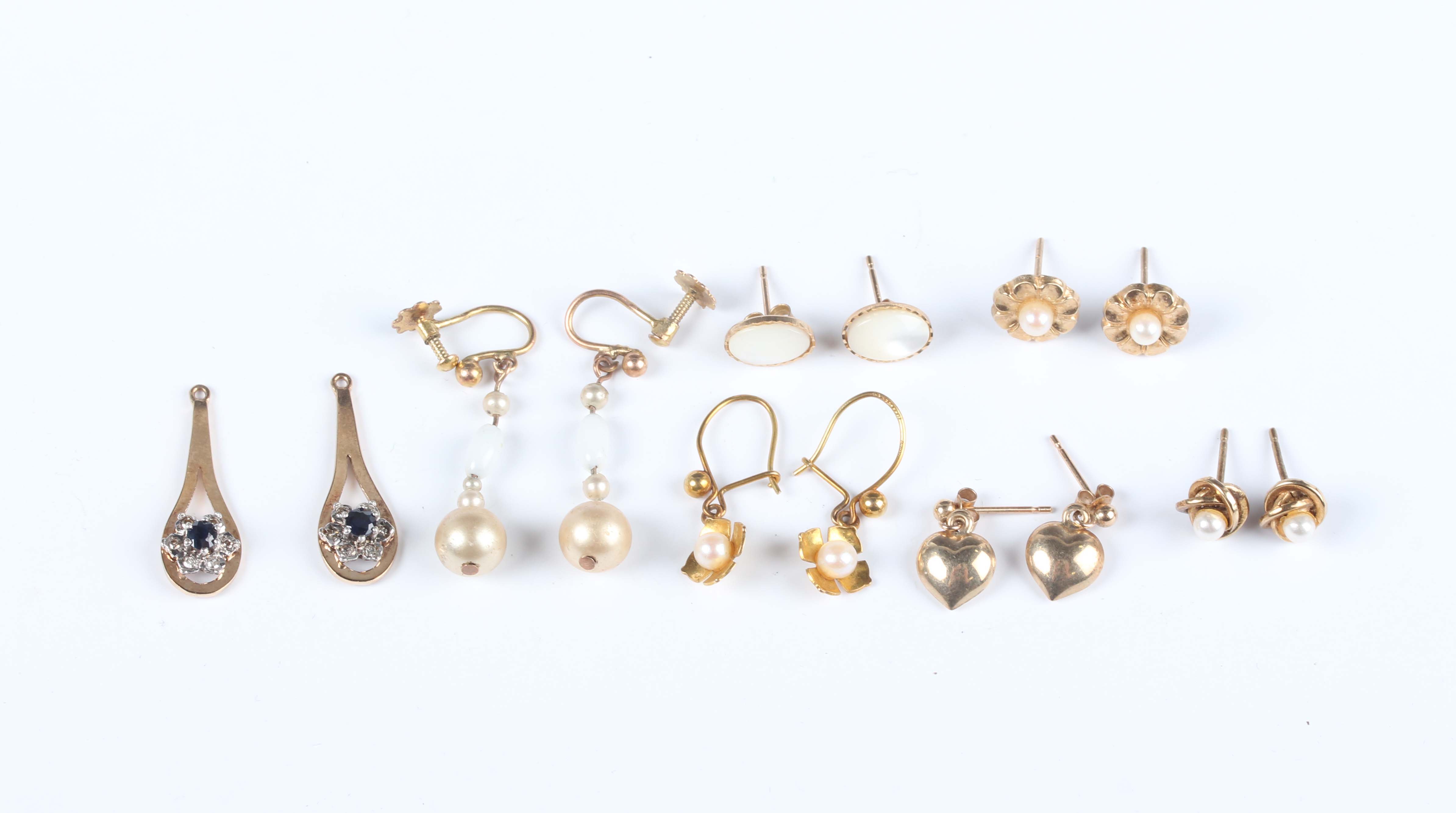 A pair of gold, sapphire and diamond cluster earring drops, unmarked, weight 1.8g (fittings lacking), a pair of 9ct gold and cultured pearl earrings with hooked wire fittings, a pair of gold heart shaped pendant earrings, each butterfly detailed '9ct', a pair of imitation pearl earrings, the screw fittings detailed ‘9ct’, total weight 3.6g and three further pairs of gold earstuds, all unmarked, total weight 1.9g.