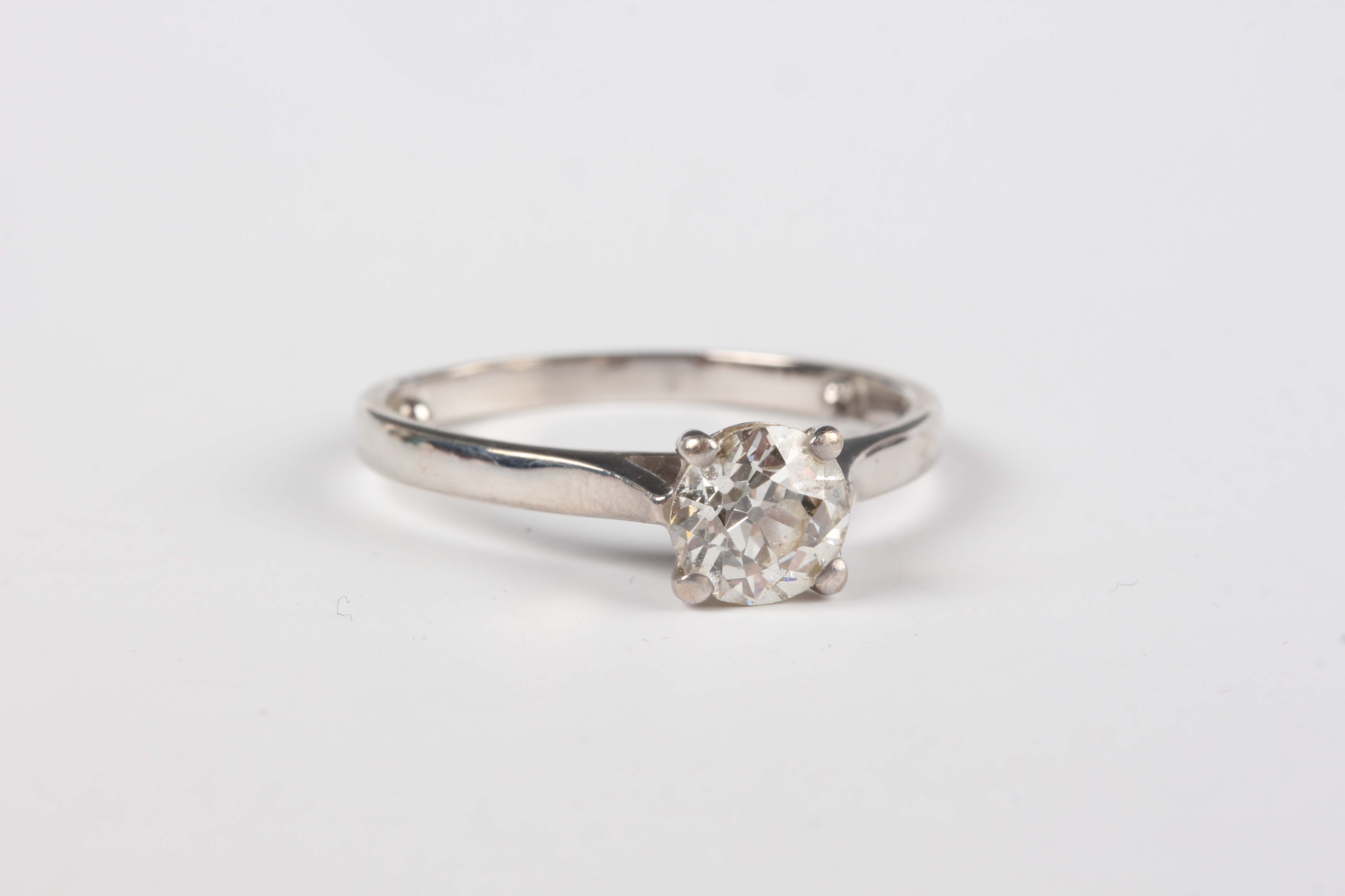An 18ct white gold and diamond single stone ring, claw set an old cut cushion shaped diamond, weight 3.5g, fitted with sizing beads, weight 3.5g, diamond weight approx 1.00ct, ring size approx N.