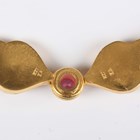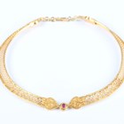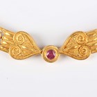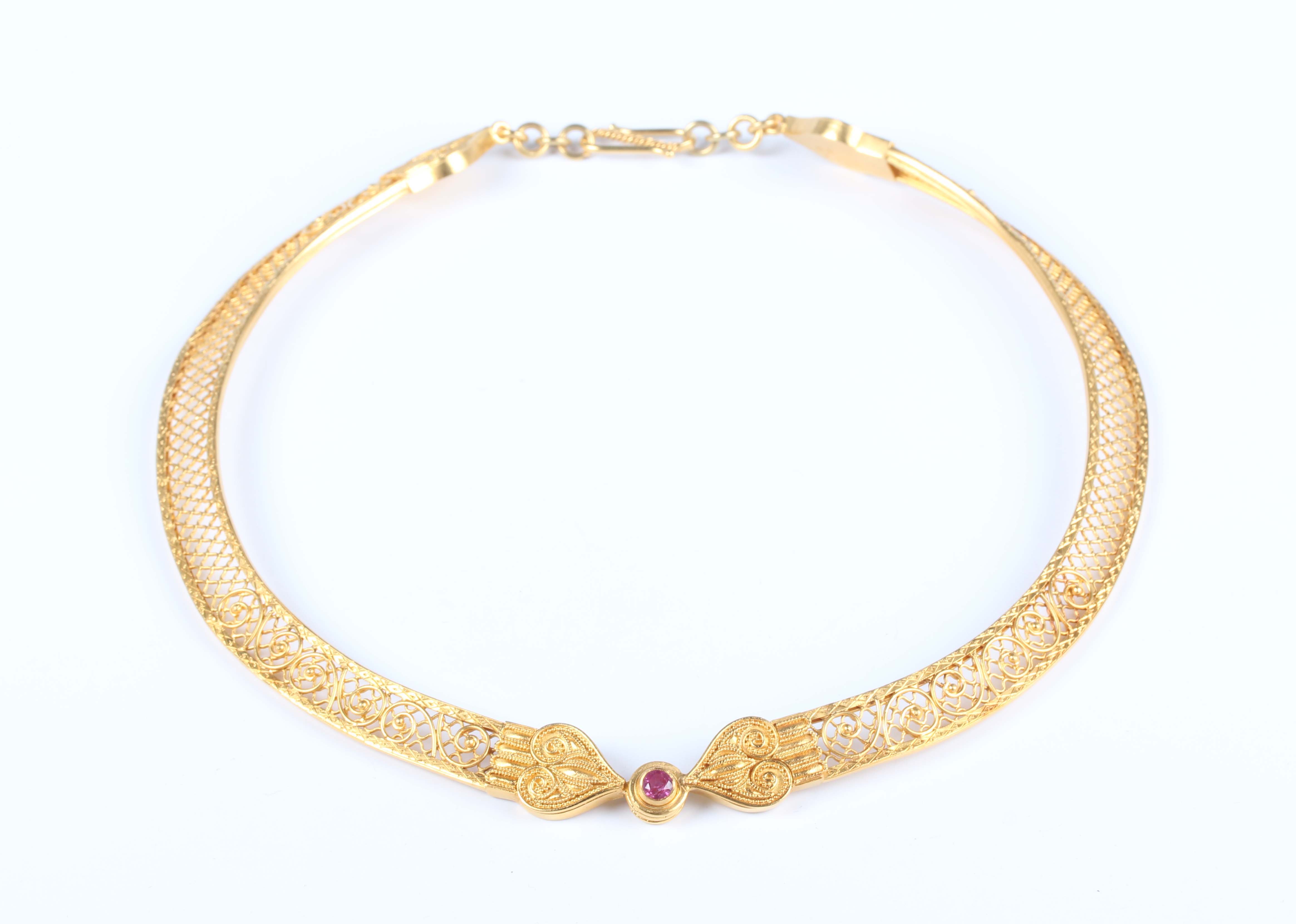 A Greek collar necklace in a pierced openwork and wirework design in the classical taste, collet set with a circular cut pink sapphire to the front, on an 'S' shaped clasp, detailed ‘K27’, weight 85.2g, inside width 14.2cm, with a case.