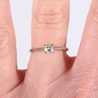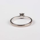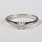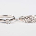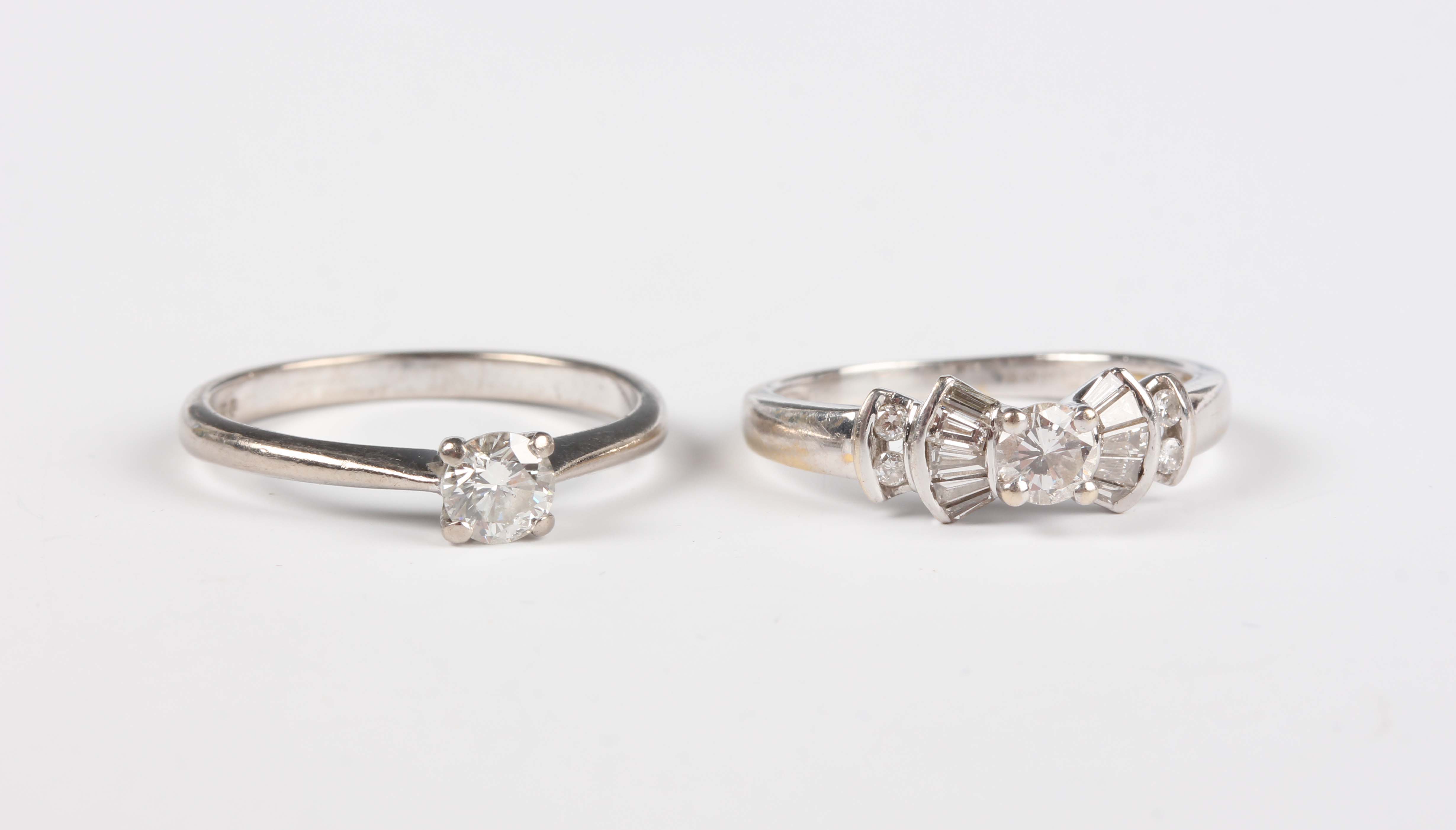 An 18ct white gold and diamond single stone ring, claw set with a circular cut diamond, ring size approx L, and an 18ct white gold and diamond ring, claw set with the principal circular cut diamond between tapered baguette and circular cut diamond set stepped shoulders, ring size approx K, total weight 4.9g.