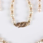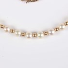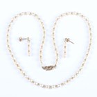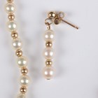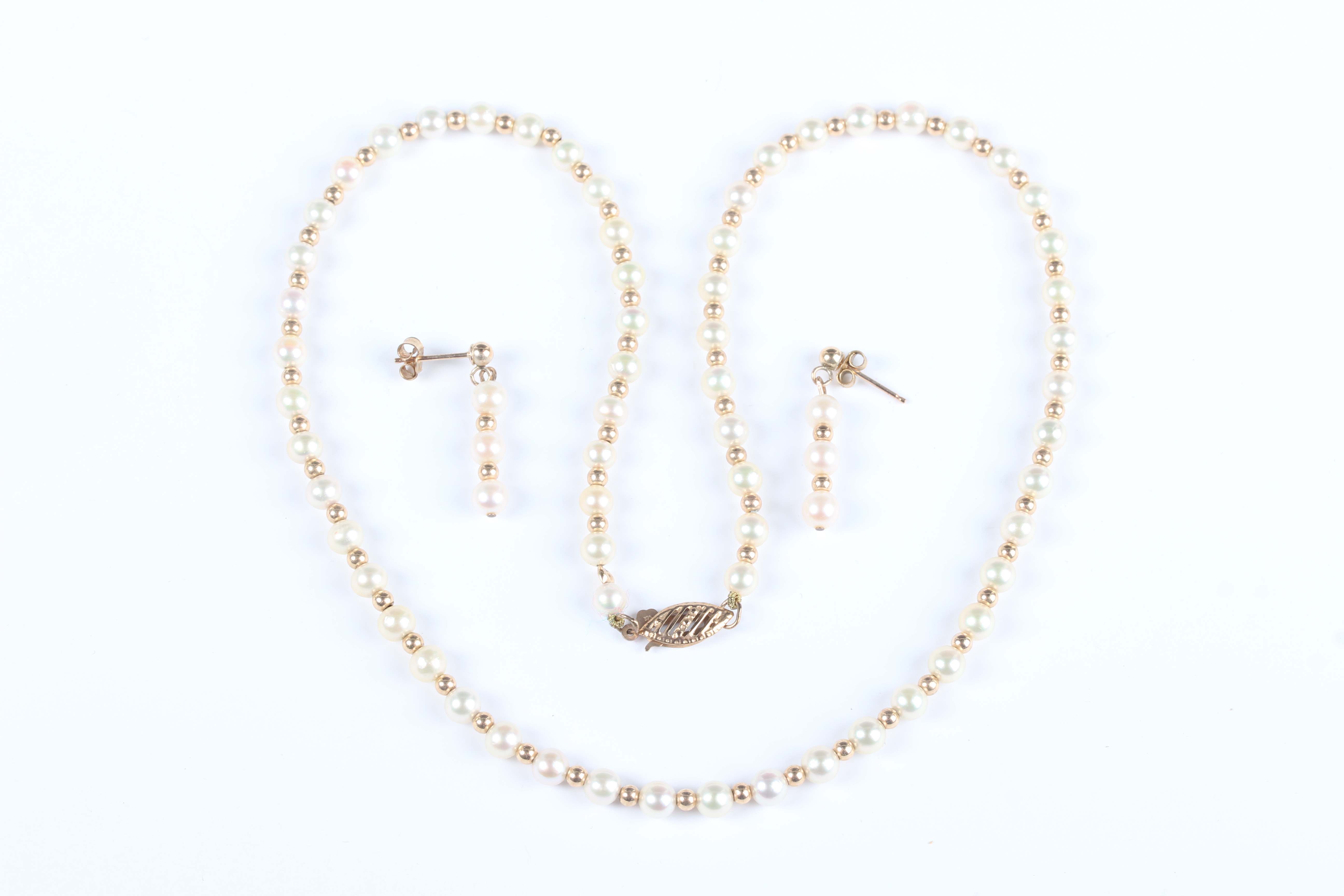 A single row necklace of uniform cultured pearls, spaced with small gold beads, on a gold marquise shaped clasp, detailed ‘375’, length 40cm, and a pair of matching pendant earrings, detailed ‘375’, length 2.3cm, with an associated case.