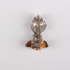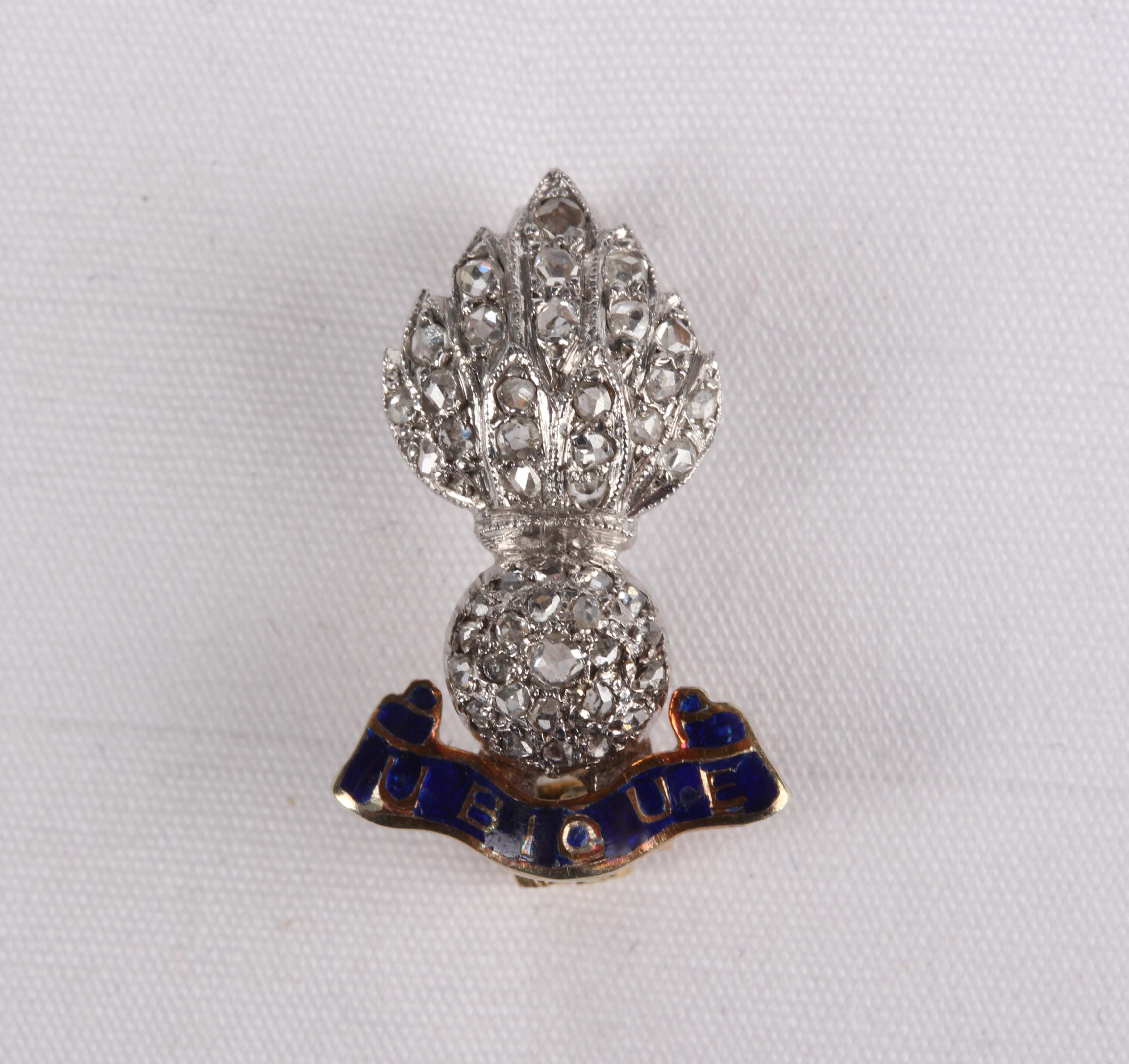 A 9ct two colour gold, rose cut diamond and enamelled military sweetheart brooch, designed as a flaming grenade above the motto 'Ubique', Birmingham 1958, weight 2.4g, width 2.1cm.