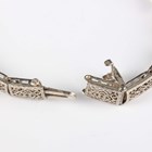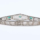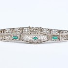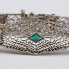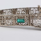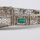 A white gold and green paste set bracelet in a filigree design, mounted with three variously cut green pastes, on a snap clasp, detailed ‘14K’, weight 14g, length 18cm.