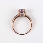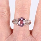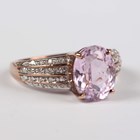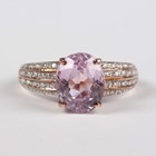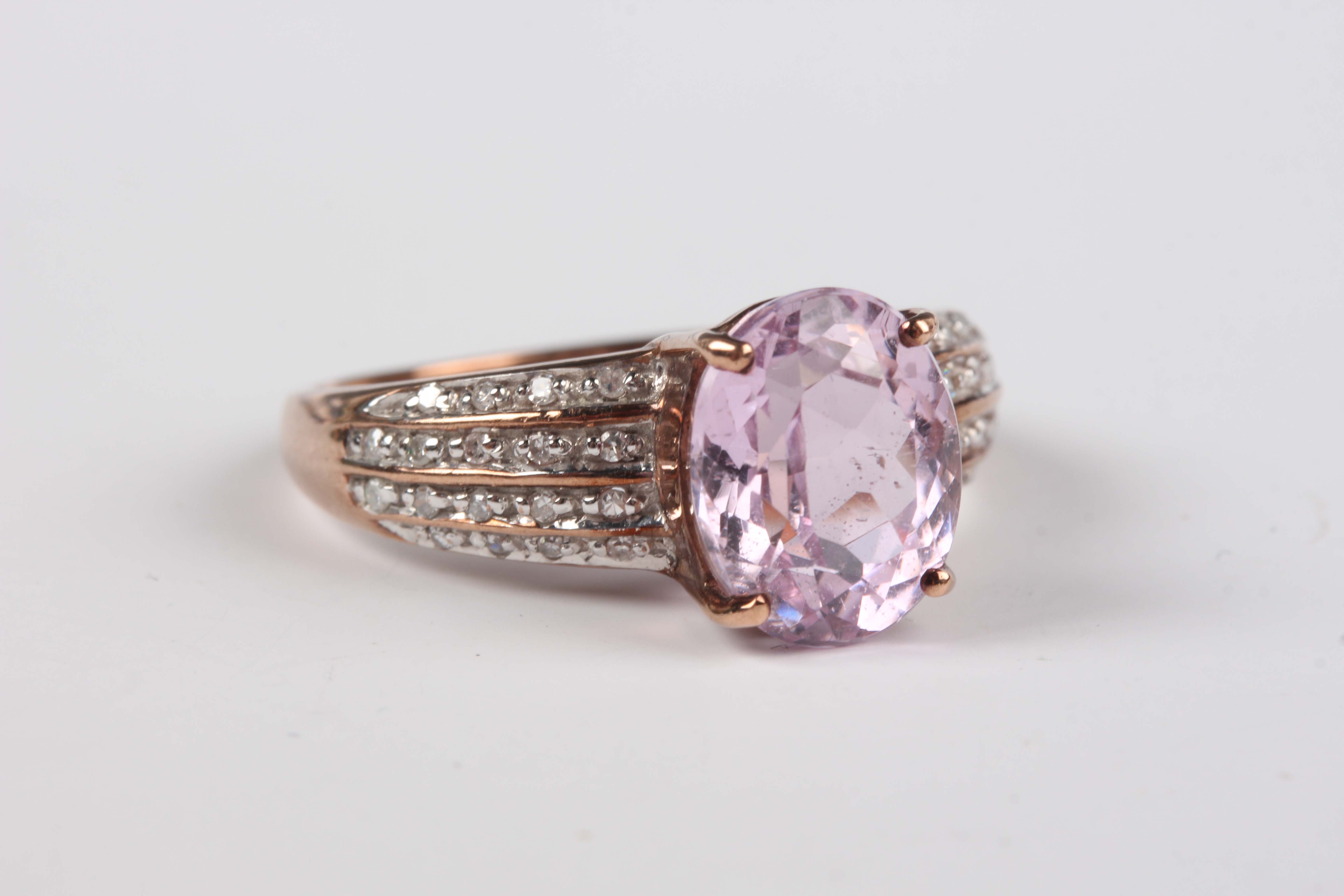 A 9ct gold ring, claw set with an oval cut pink kunzite between diamond set four row shoulders, weight 3.7g, ring size approx T.