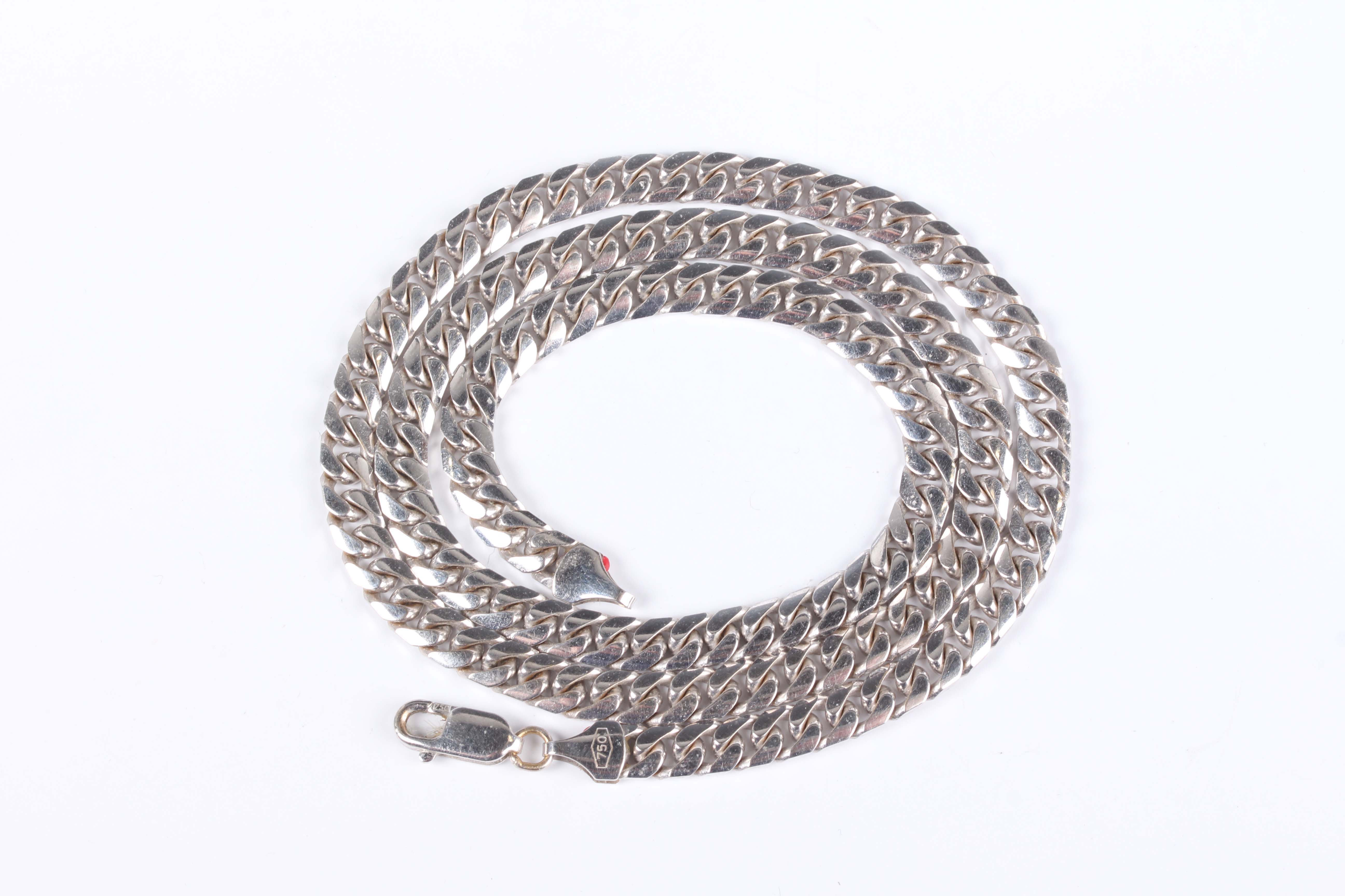 A white gold neckchain in a faceted curblink design, detailed ‘750 Italy’, on a sprung hook shaped clasp, detailed ‘750 Italy’, weight 55.3g, length 55cm.