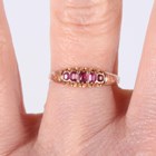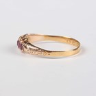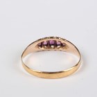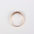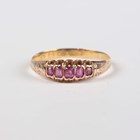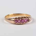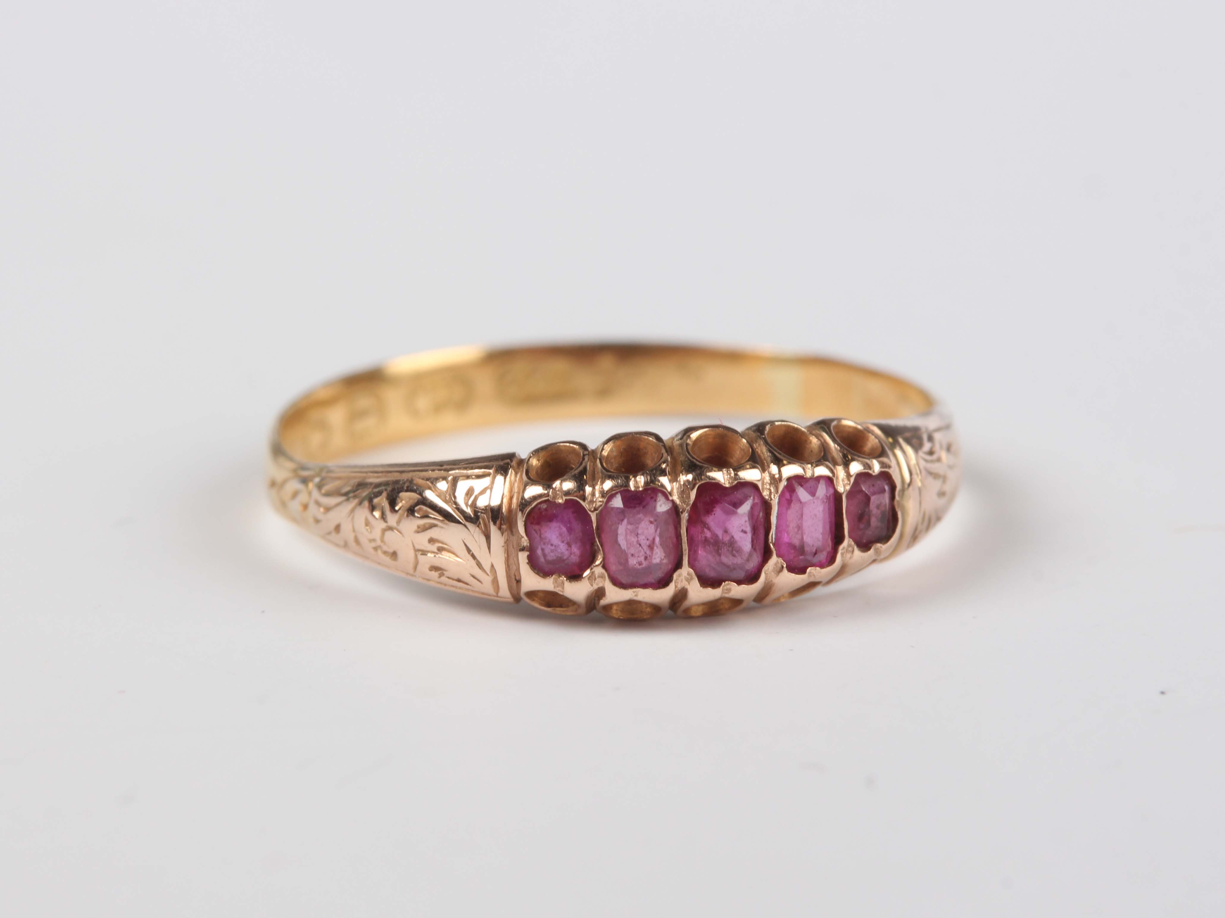 A gold and ruby five stone ring, mounted with a graduated row of cushion shaped rubies between engraved shoulders, weight 1.4g, ring size approx M (reshanked).