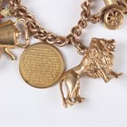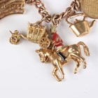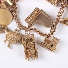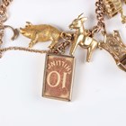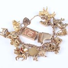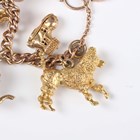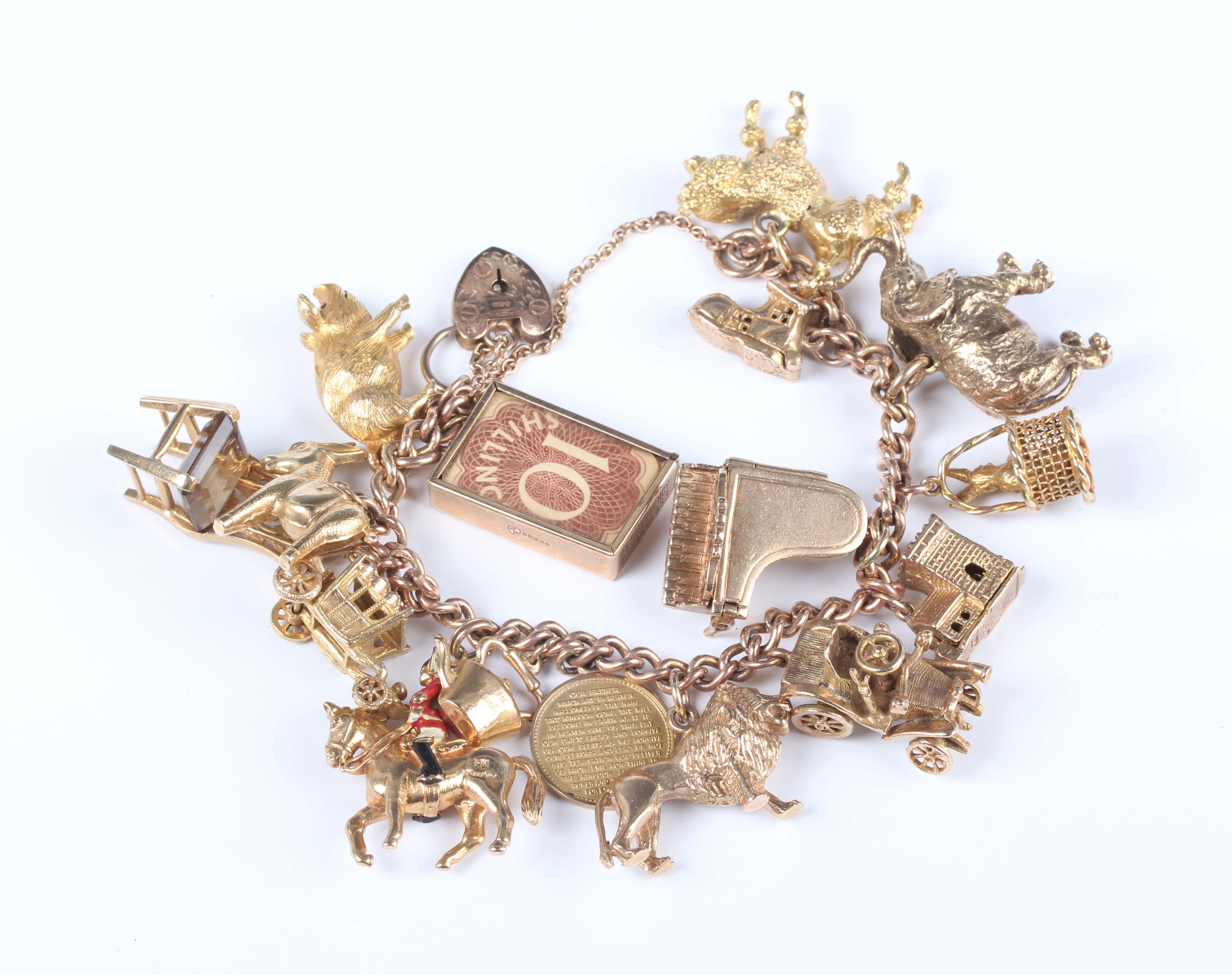 A 9ct gold curblink charm bracelet on a 9ct gold heart shaped padlock clasp, fitted with fifteen 9ct gold charms, including a piano, an elephant and a lion, and a gold donkey charm, unmarked, total weight 95.3g.