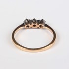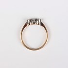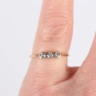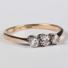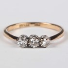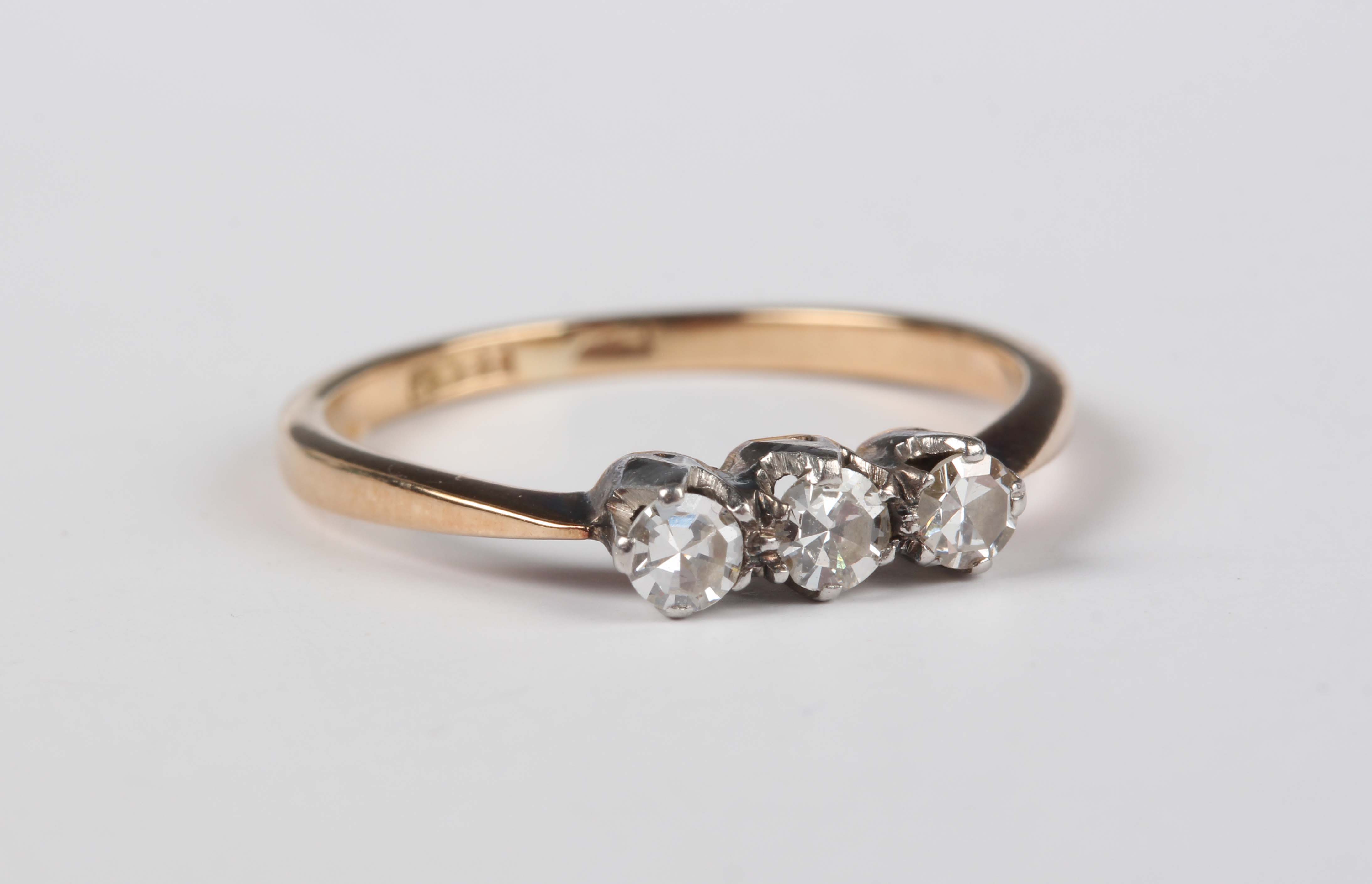 A gold and diamond three stone ring, claw set with a row of circular cut diamonds, detailed ‘18ct’, weight 1.8g, ring size approx J1/2.