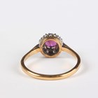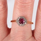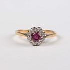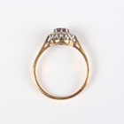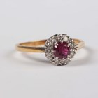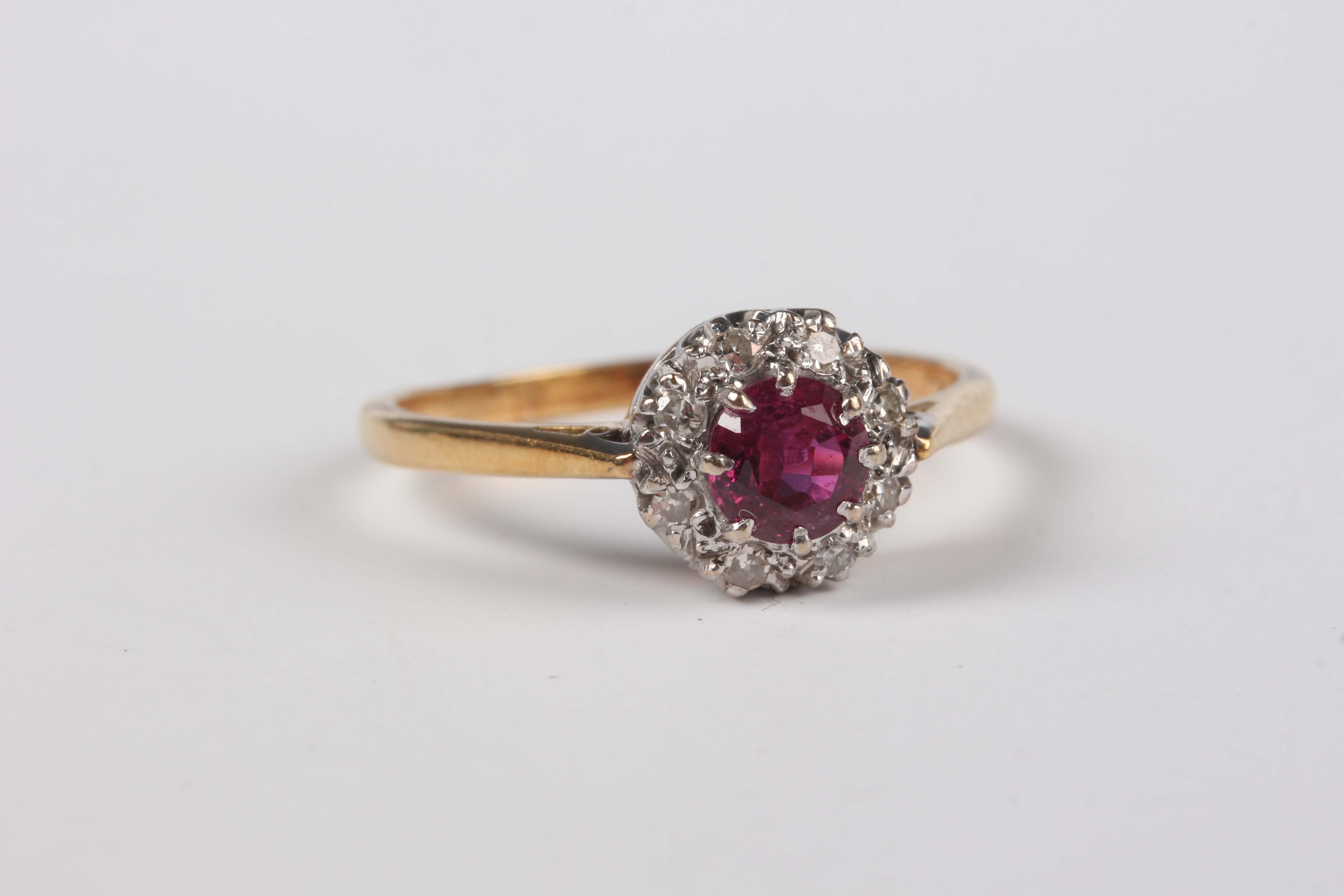A gold, ruby and diamond cluster ring, claw set with a circular cut ruby within a surround of circular cut diamonds, detailed ‘18ct’, weight 3.5g, ring size approx R1/2.
