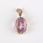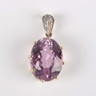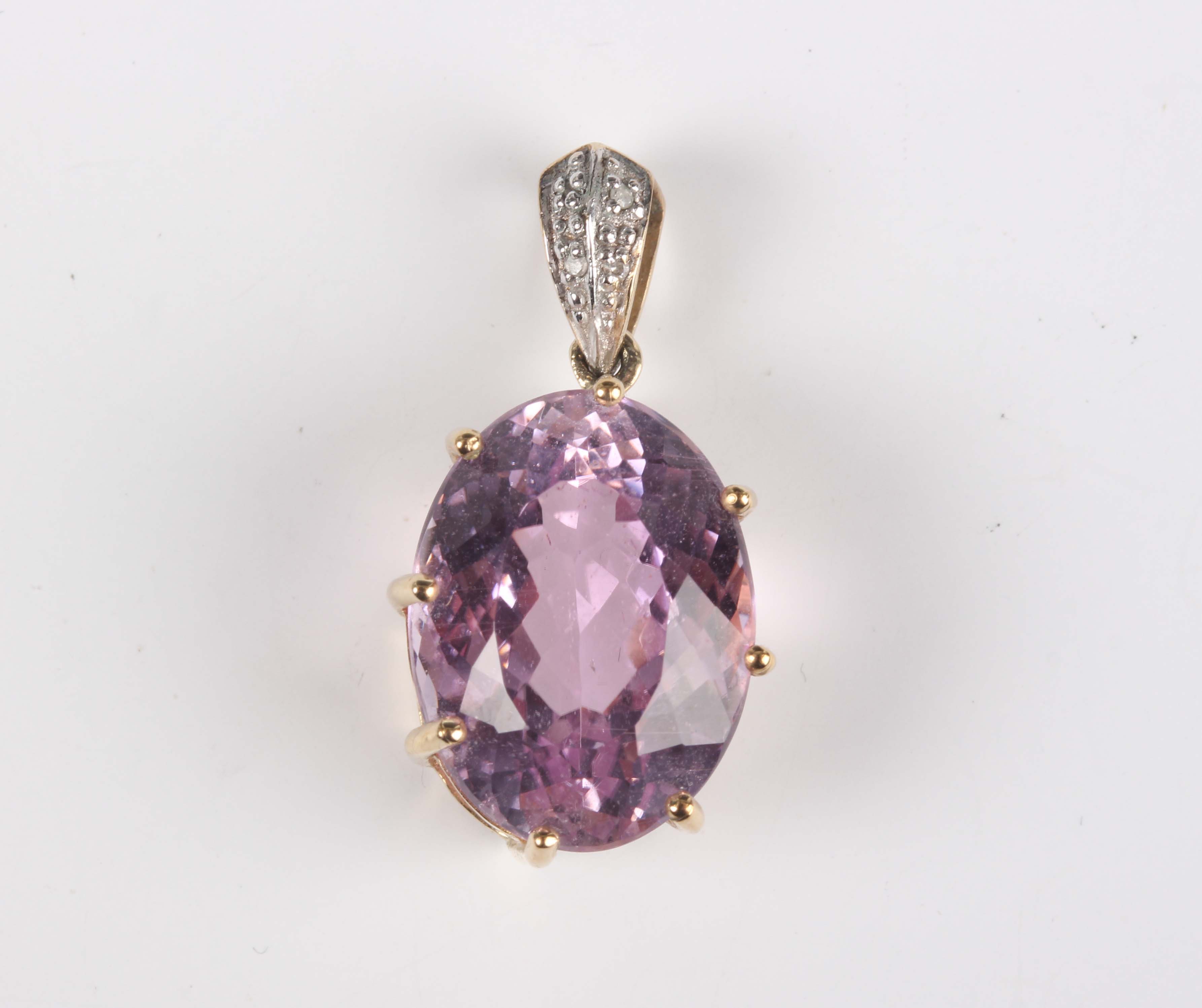 A 9ct gold pendant, claw set with an oval cut pink kunzite, with a diamond set surmount, weight 4g, kunzite weight approx 9.50ct, length 2.5cm.