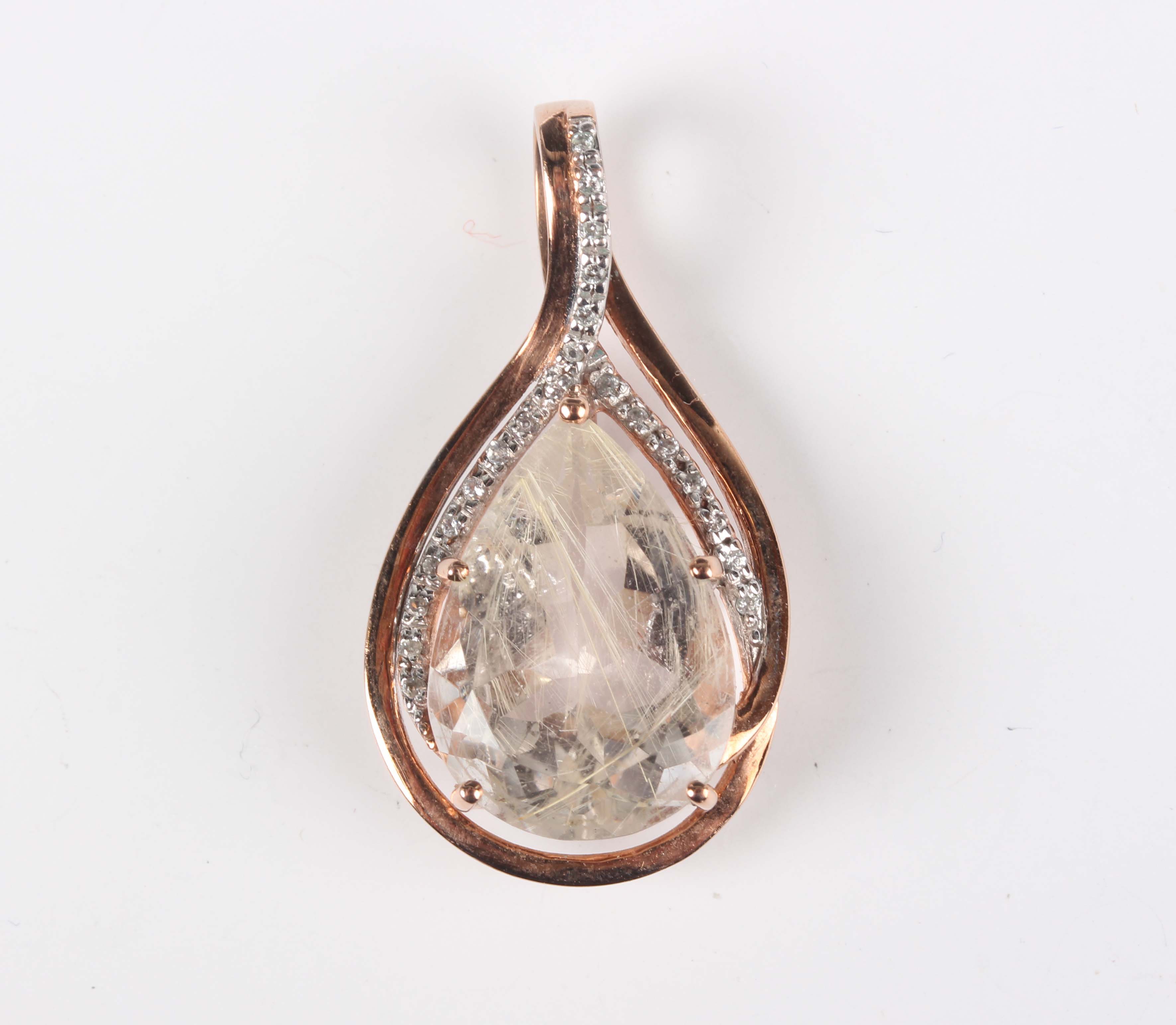 A 9ct gold pendant, the centre claw set with a pear shaped rutilated quartz, weight 5g, length 3.3cm.