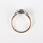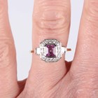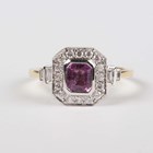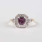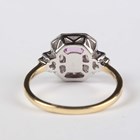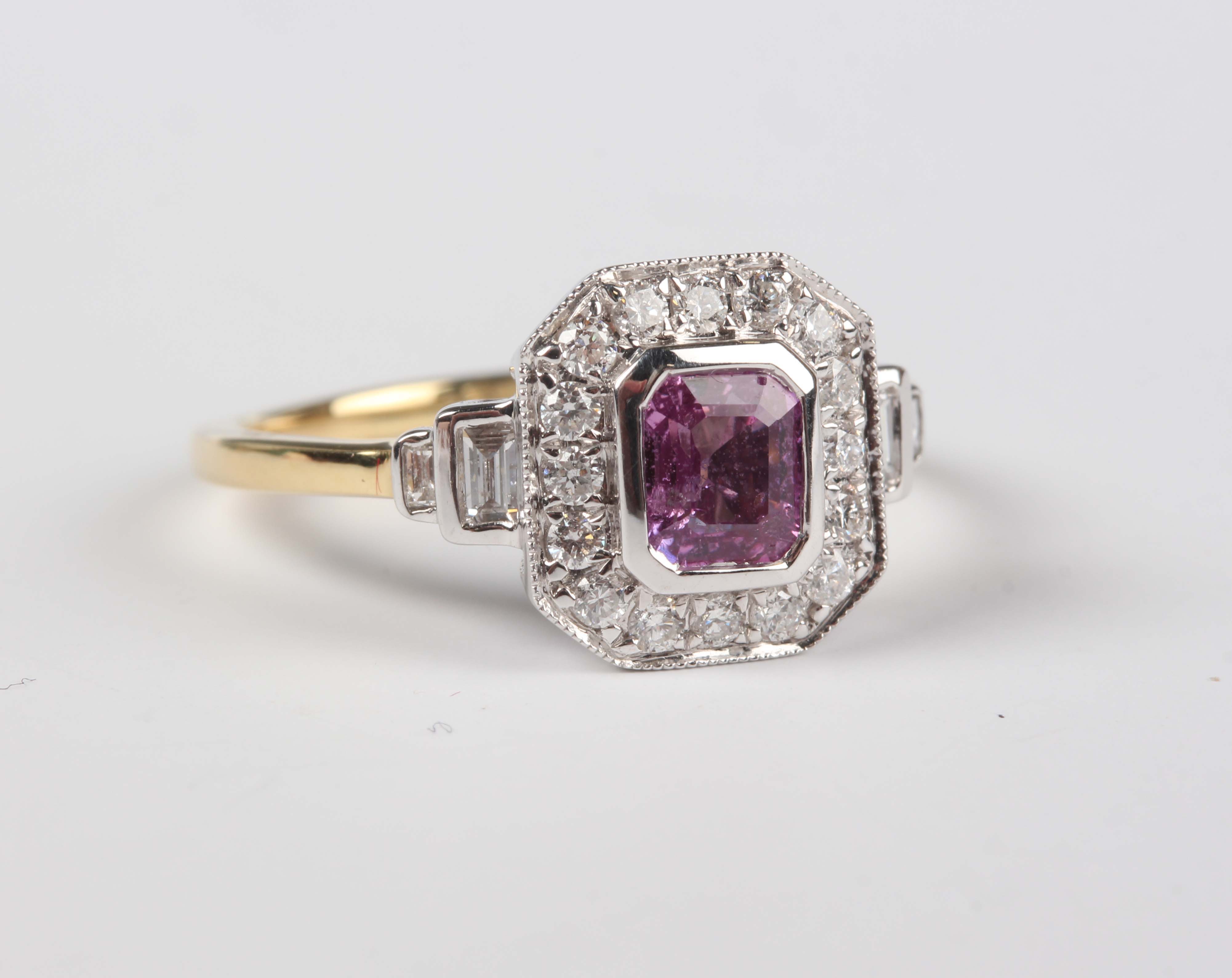 An 18ct two colour gold, pink sapphire and diamond ring, mounted with a cut cornered rectangular step cut pink sapphire within a surround of circular cut diamonds, between diamond set two stone shoulders, detailed '18K 750', weight 3.5g, pink sapphire weight approx 0.84ct, total diamond weight approx 0.35ct, ring size approx N.