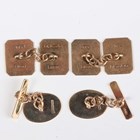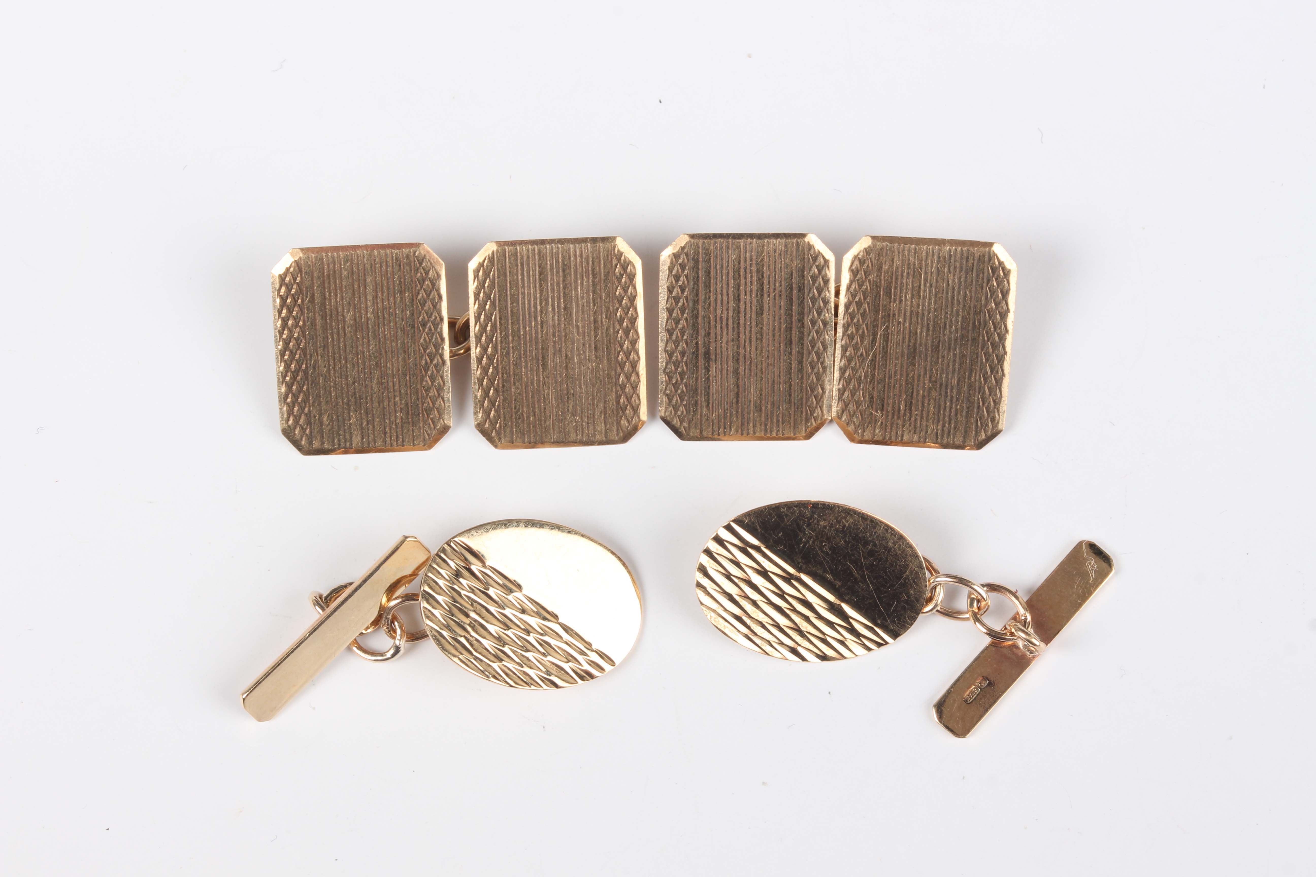 A pair of 9ct gold cut cornered rectangular cufflinks with engine turned decoration, London 1950, and a pair of 9ct gold cufflinks with oval fronts and bar form backs, total weight 5.7g.