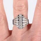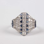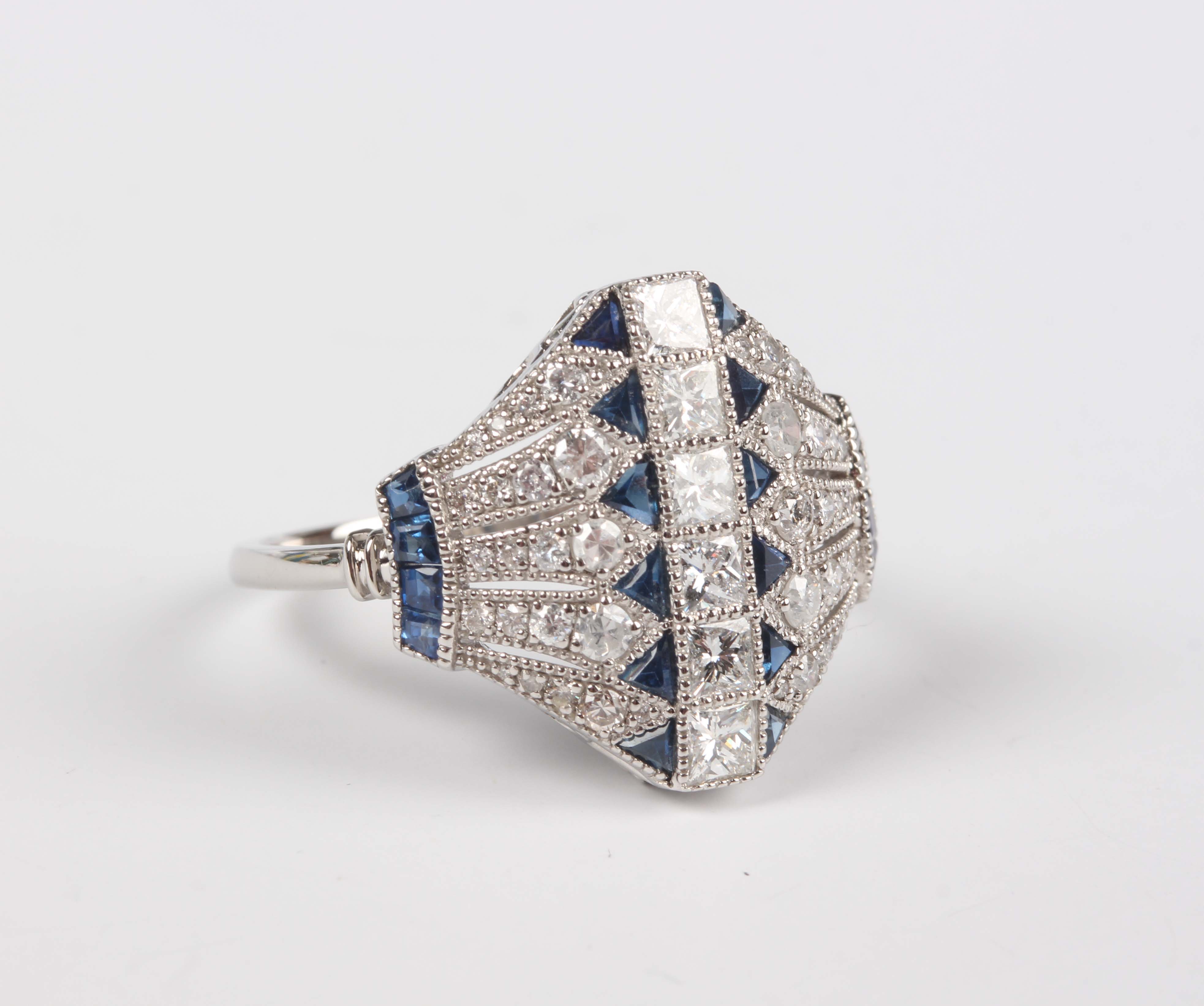A platinum, sapphire and diamond panel shaped ring, mounted with a row of six princess cut diamonds between tapering sides mounted with variously cut sapphires and circular cut diamonds, detailed 'Pt950', weight 4.7g, total diamond weight approx 1.03ct , total sapphire weight approx 0.24ct, ring size approx N1/2.