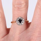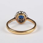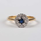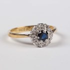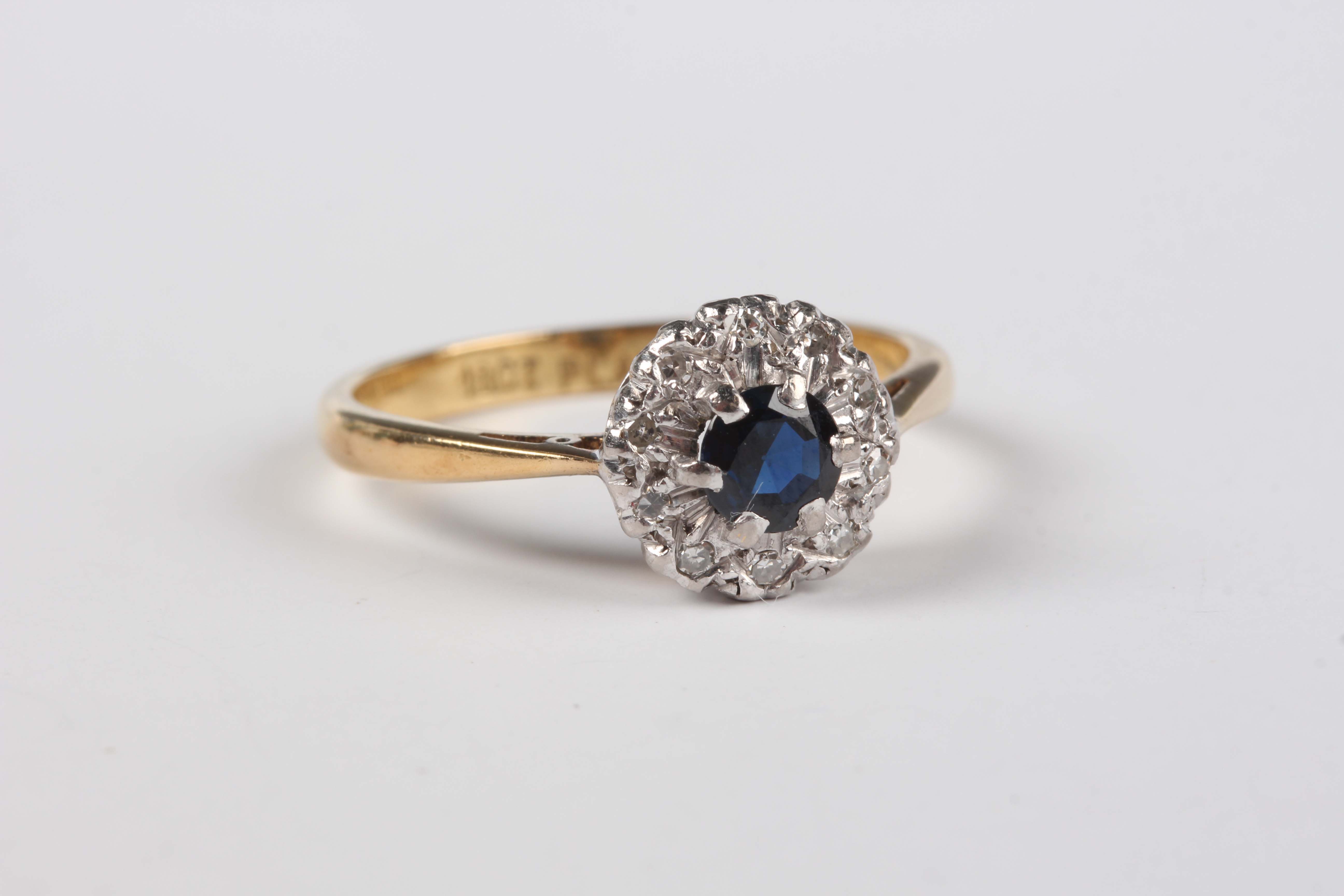 A gold and platinum, sapphire and diamond cluster ring, claw set with the circular cut sapphire within a surround of circular cut diamonds, detailed ‘18ct Plat’, weight 3.5g, ring size approx P.