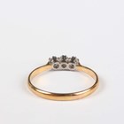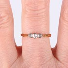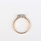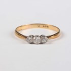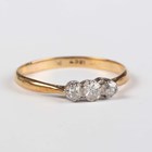A gold, platinum and diamond three stone ring, claw set with a row of old cut cushion shaped diamonds, detailed ‘18ct PL’, weight 1.8g, ring size approx Q.