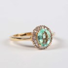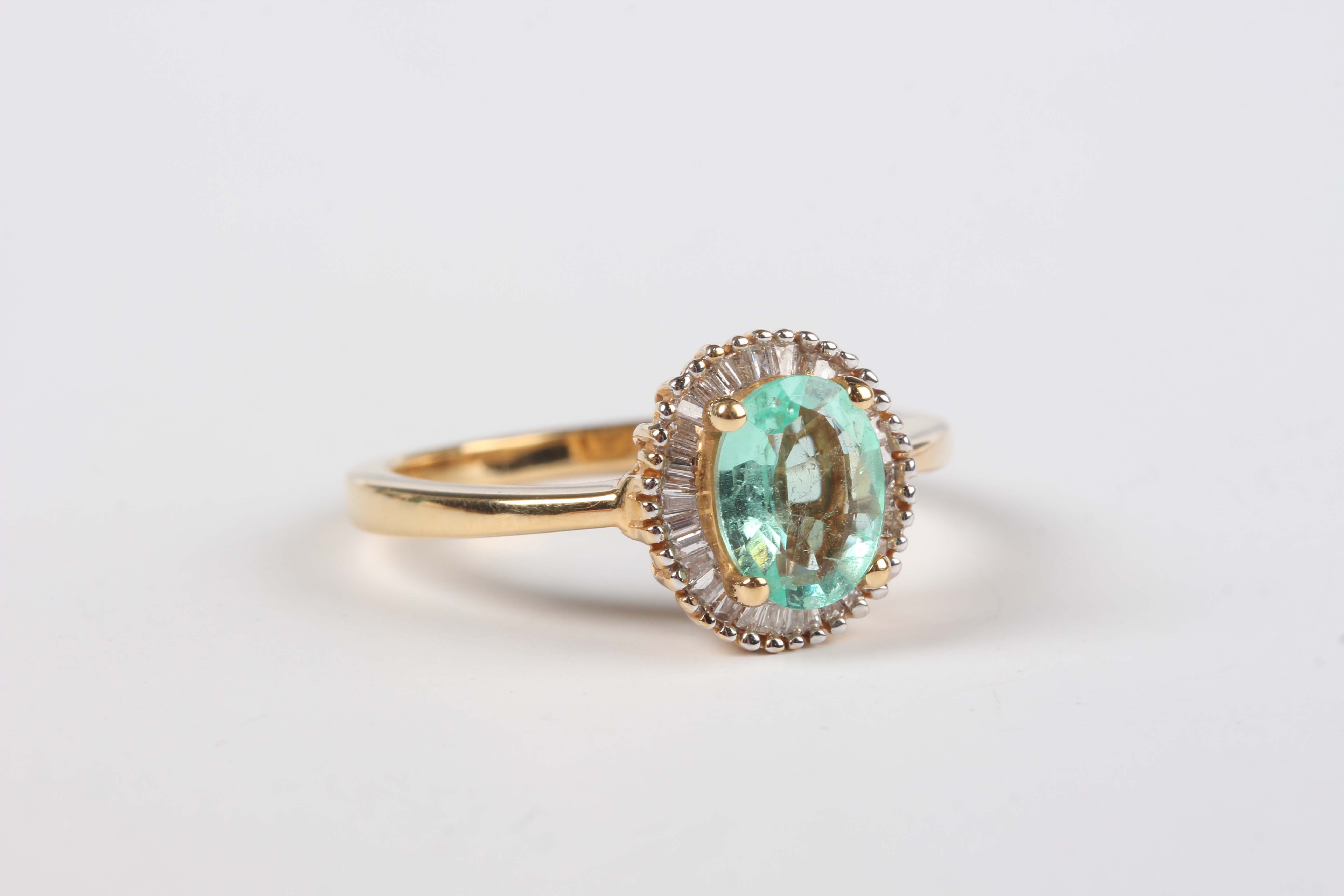 An 18ct gold, emerald and diamond cluster ring, claw set with the oval cut emerald within a surround of tapered baguette cut diamonds, detailed ‘18K ILIANA’, weight 4.5g, ring size approx P1/2.