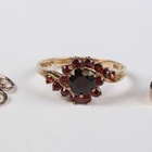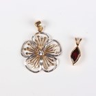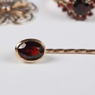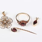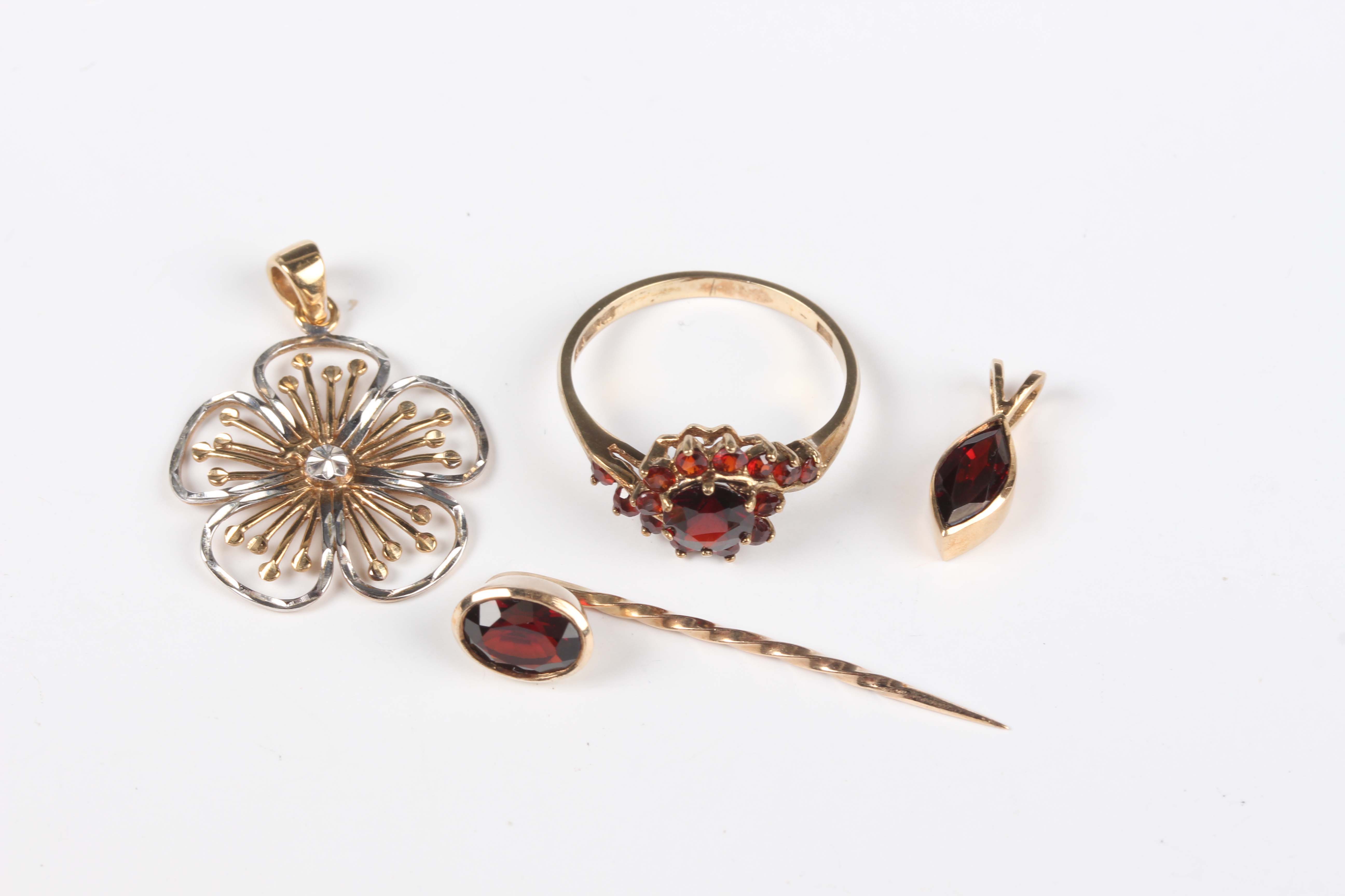 A 9ct gold and garnet cluster ring in a twistover design, ring size approx L, a 9ct two colour gold pendant, designed as a flowerhead, total weight 2.7g, a gold and garnet single stone stickpin, unmarked, and a gold and marquise shaped garnet single stone pendant, unmarked, total weight 1.6g.