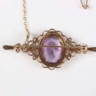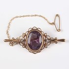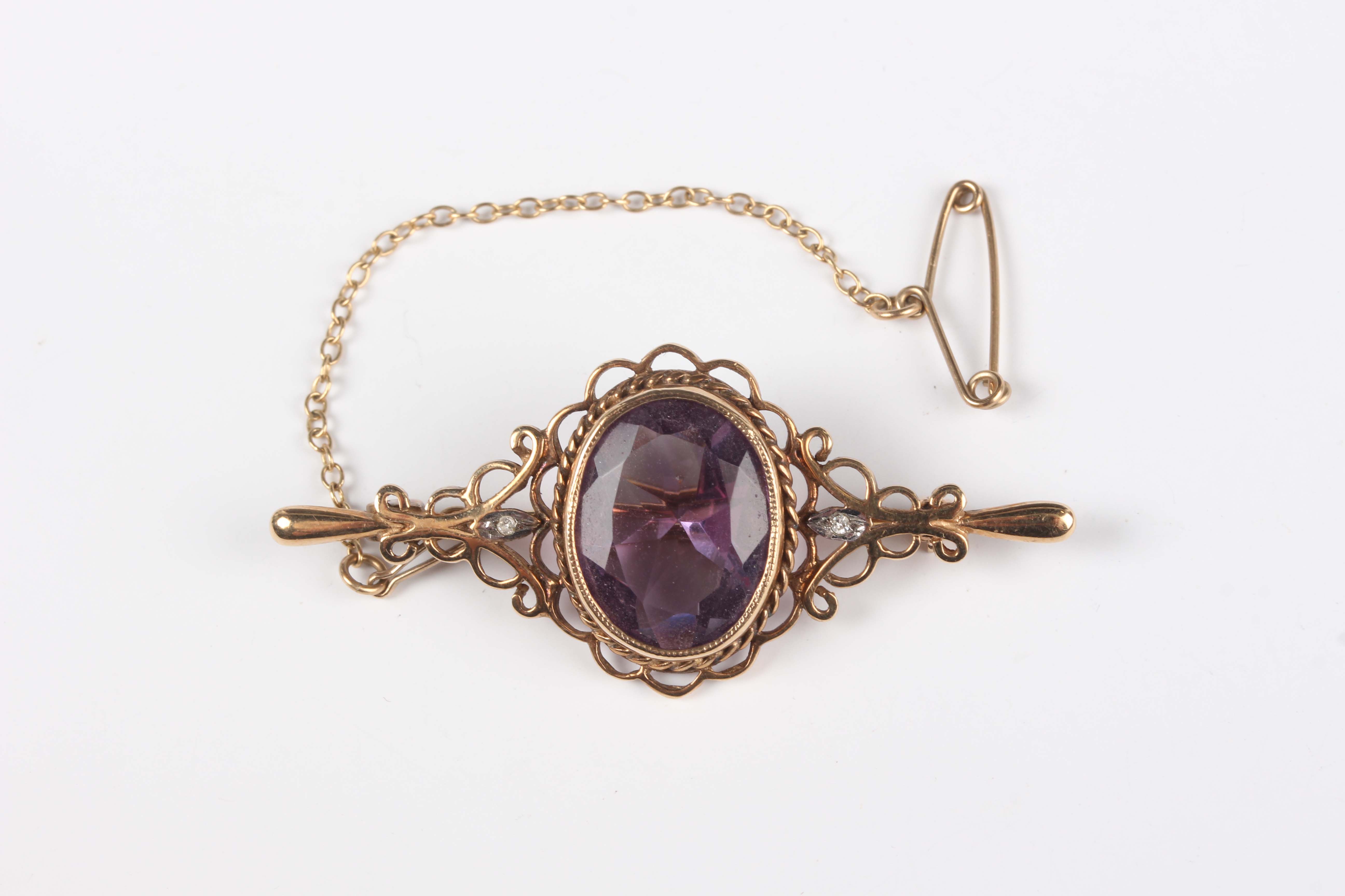 A 9ct gold and amethyst brooch, collet set with the oval cut amethyst within a ropetwist wirework surround, otherwise mounted with a diamond to either side, weight 6g, width 4.9cm.