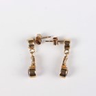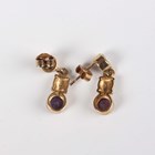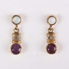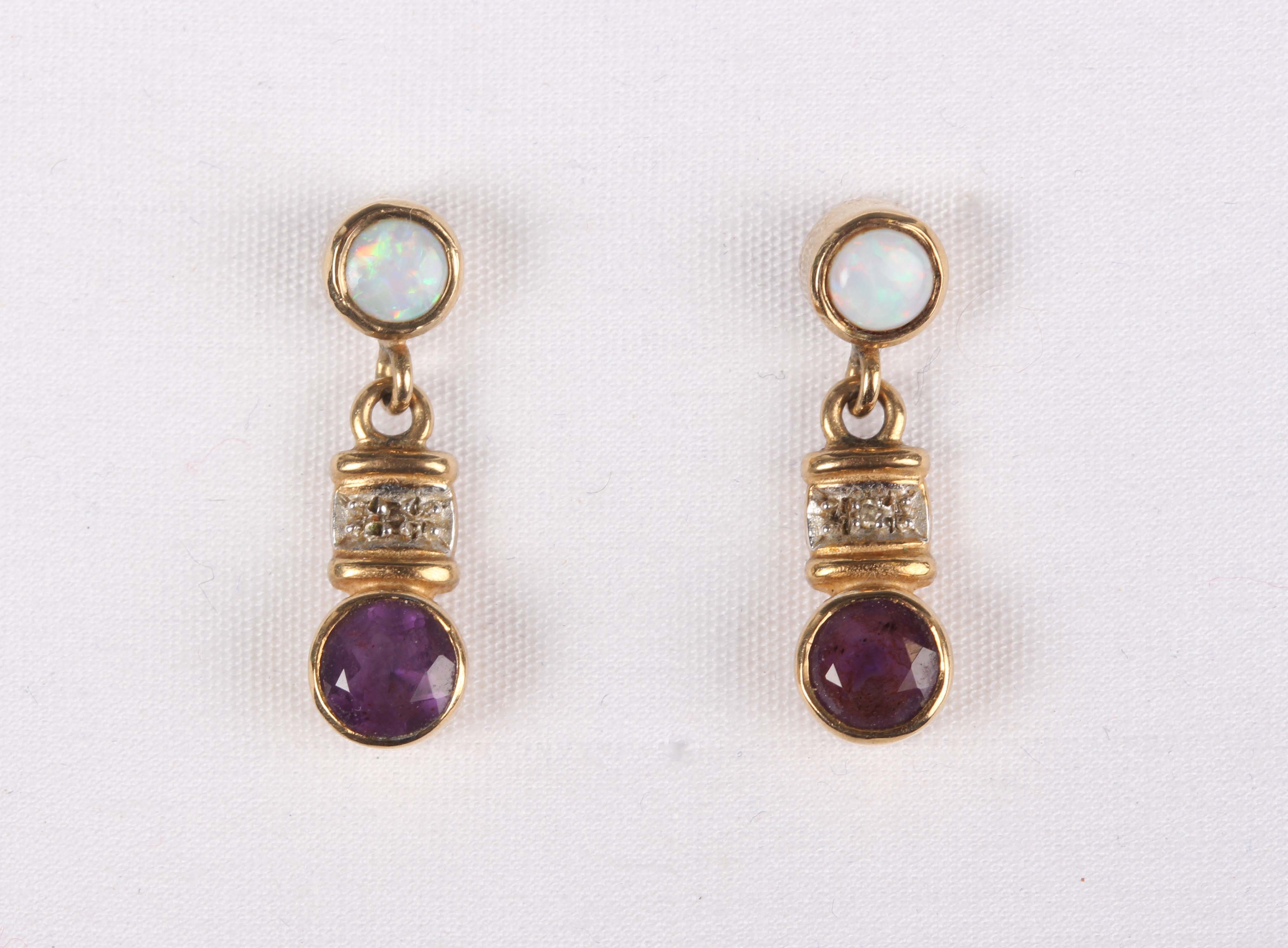 A pair of 9ct gold, amethyst, opal and diamond earrings, each collet set with a circular cut amethyst below a circular cut diamond, with an opal set surmount, with post and butterfly fittings, weight 2.6g, length 2cm.