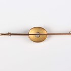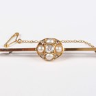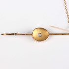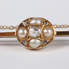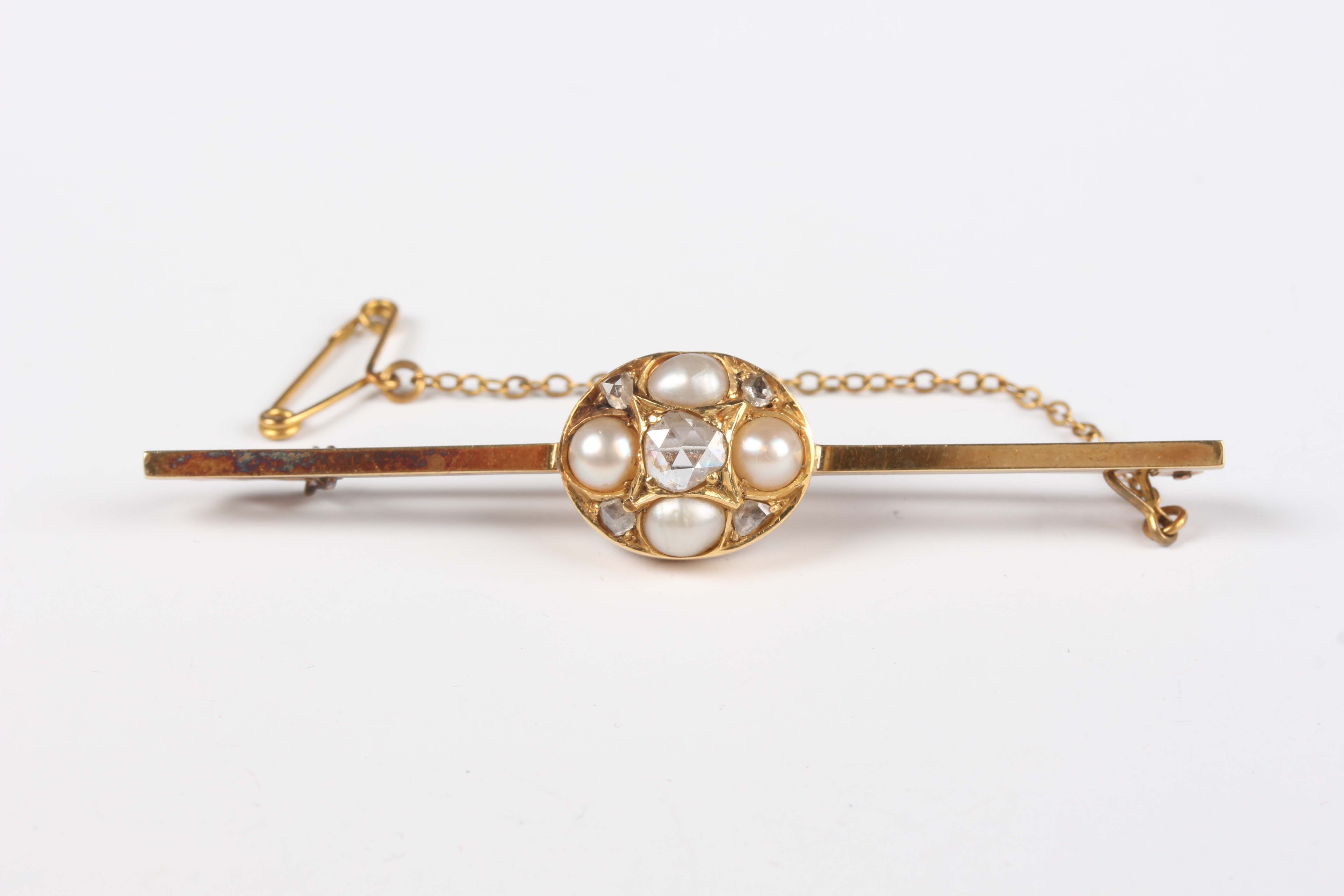 A gold, diamond and half-pearl bar brooch, mounted with the principal rose cut diamond within a surround of four half-pearls, with four smaller rose cut diamonds mounted at intervals, indistinct mark, fitted with a safety chain, weight 5.8g, width 6.4cm.