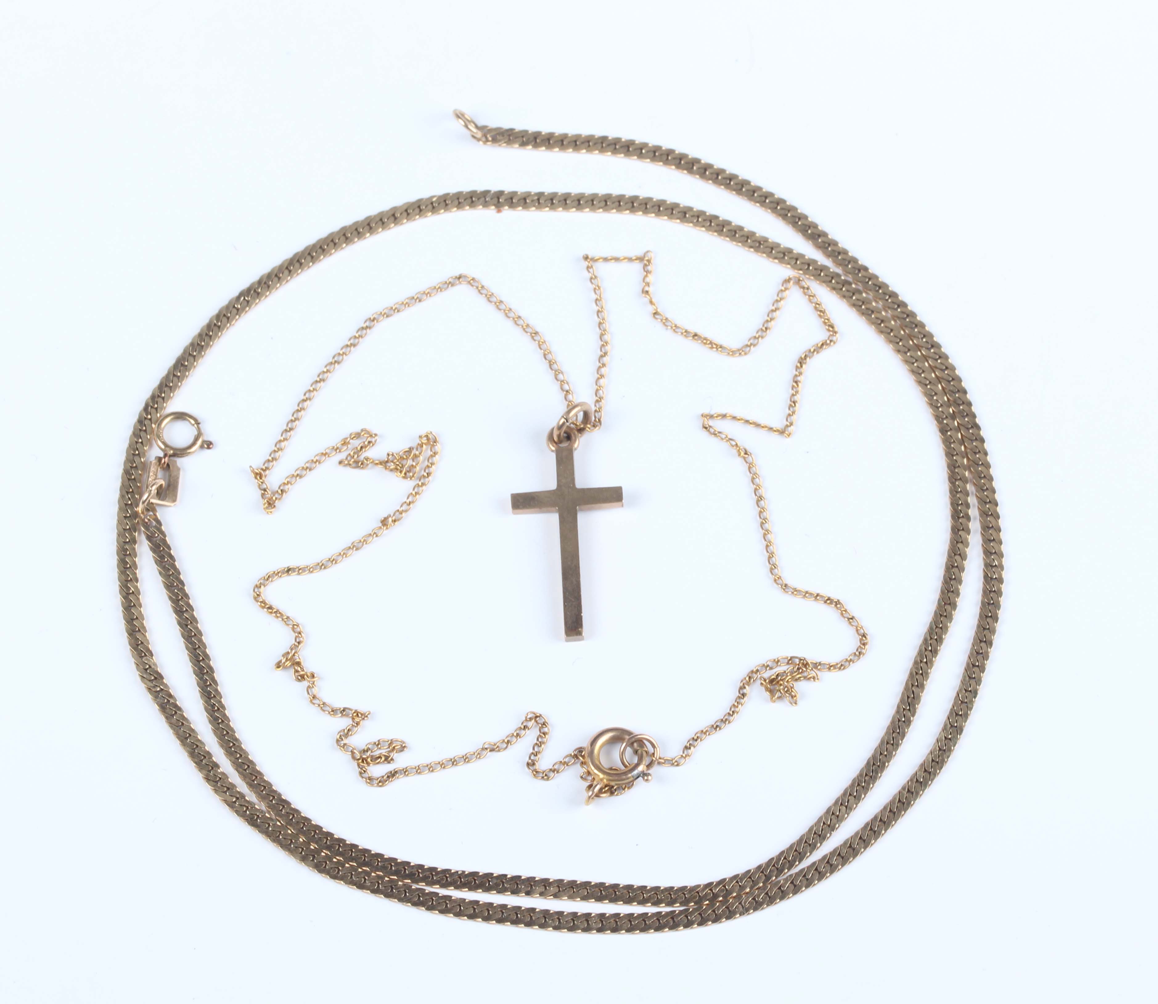 A 9ct gold, faceted curblink neckchain on a boltring clasp, detailed ‘9ct’, length 46cm, and a 9ct gold pendant cross with a gold neckchain on a boltring clasp, detailed ‘9ct’, total weight 6.8g.