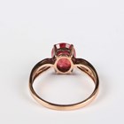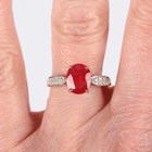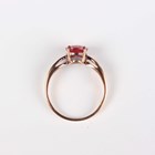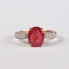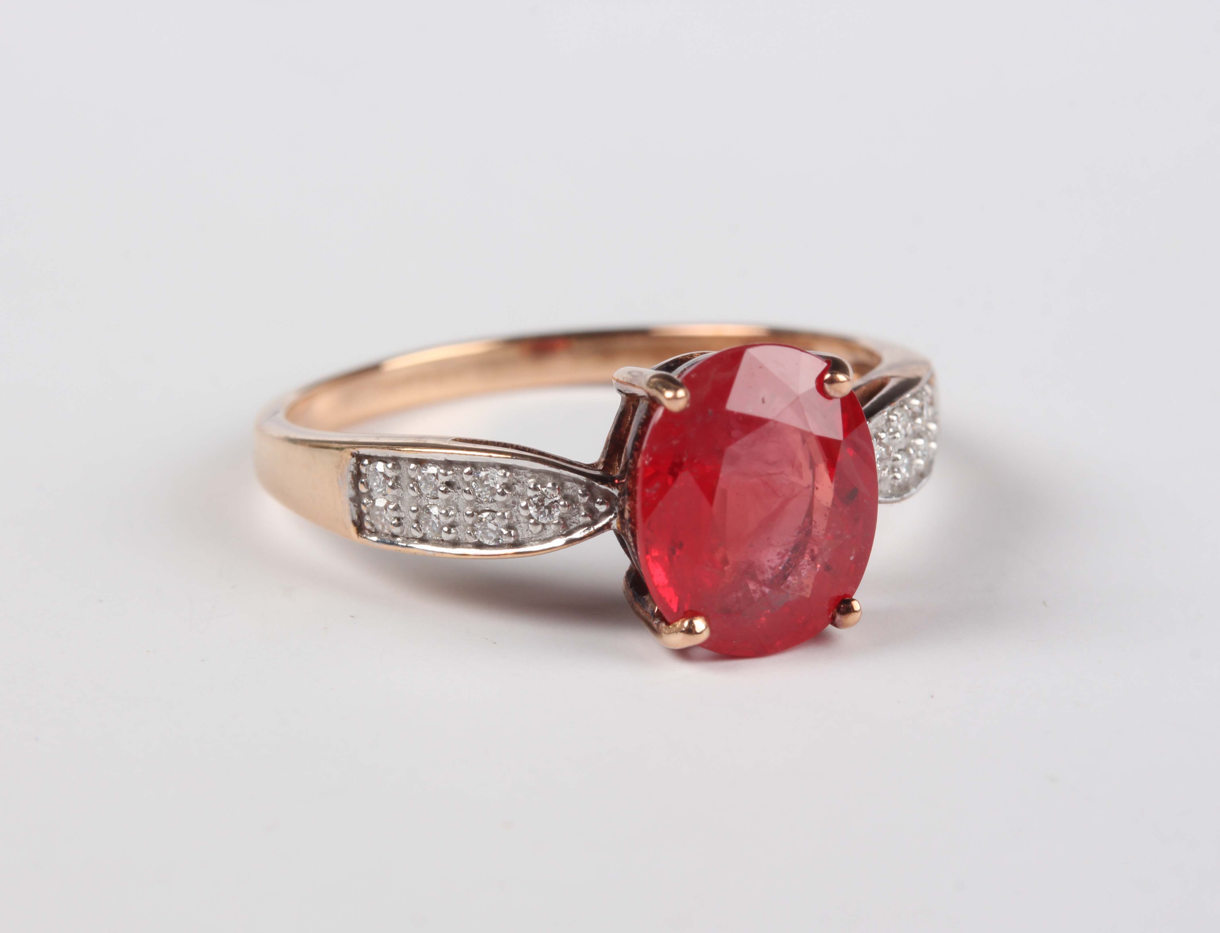 An 18ct gold ring, claw set with an oval cut synthetic ruby between diamond set shoulders, detailed ‘750’, weight 3g, ring size approx P1/2.