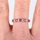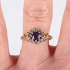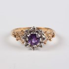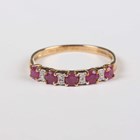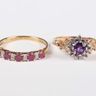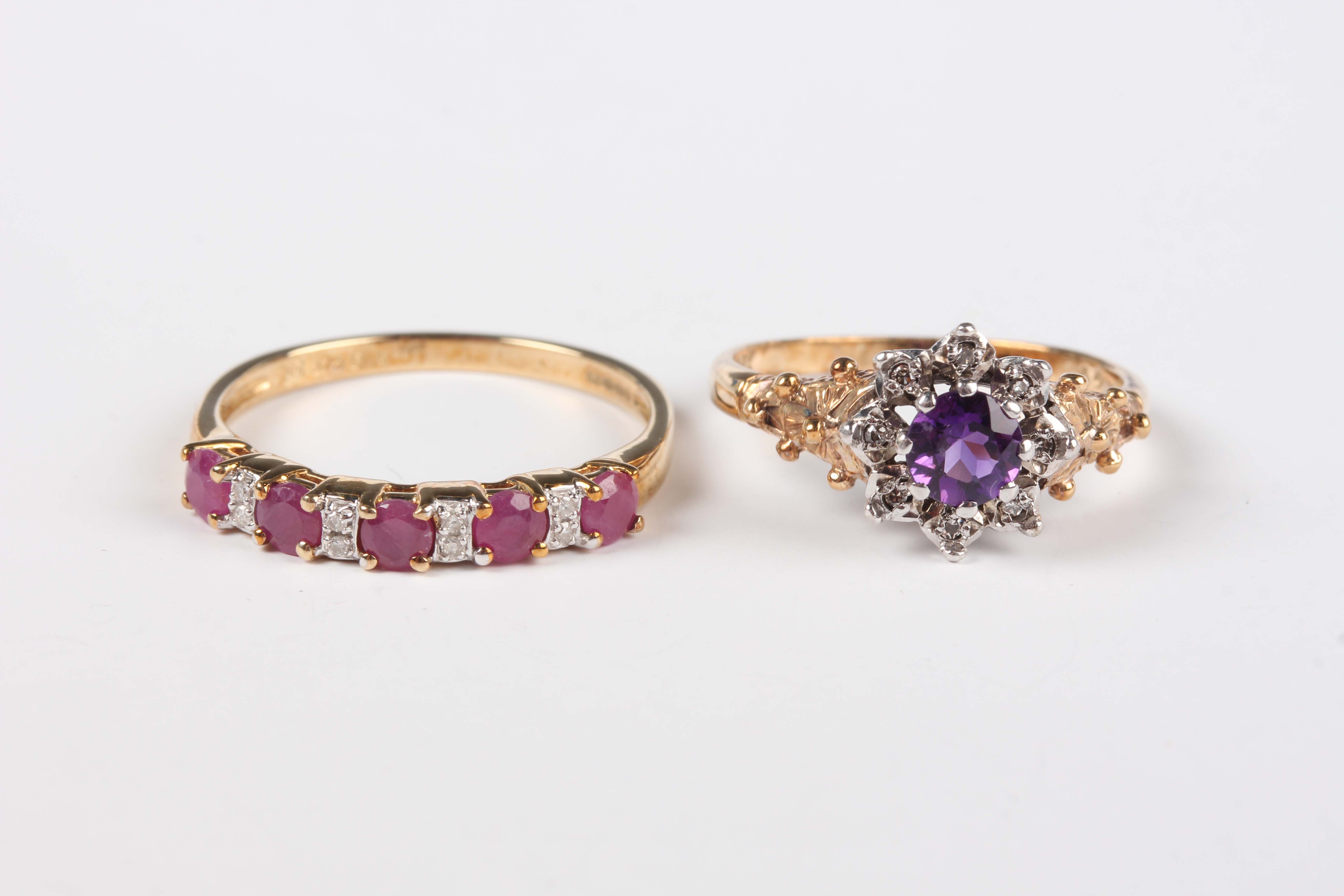 A gold, amethyst and diamond cluster ring, claw set with the circular cut amethyst at the centre, detailed ‘9ct’, ring size approx O, and a 9ct gold ruby and diamond half hoop ring, claw set with five circular cut rubies alternating with four pairs of circular cut diamonds, ring size approx S1/2, total weight 4.7g.