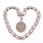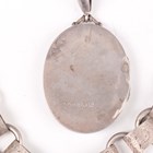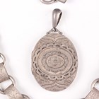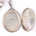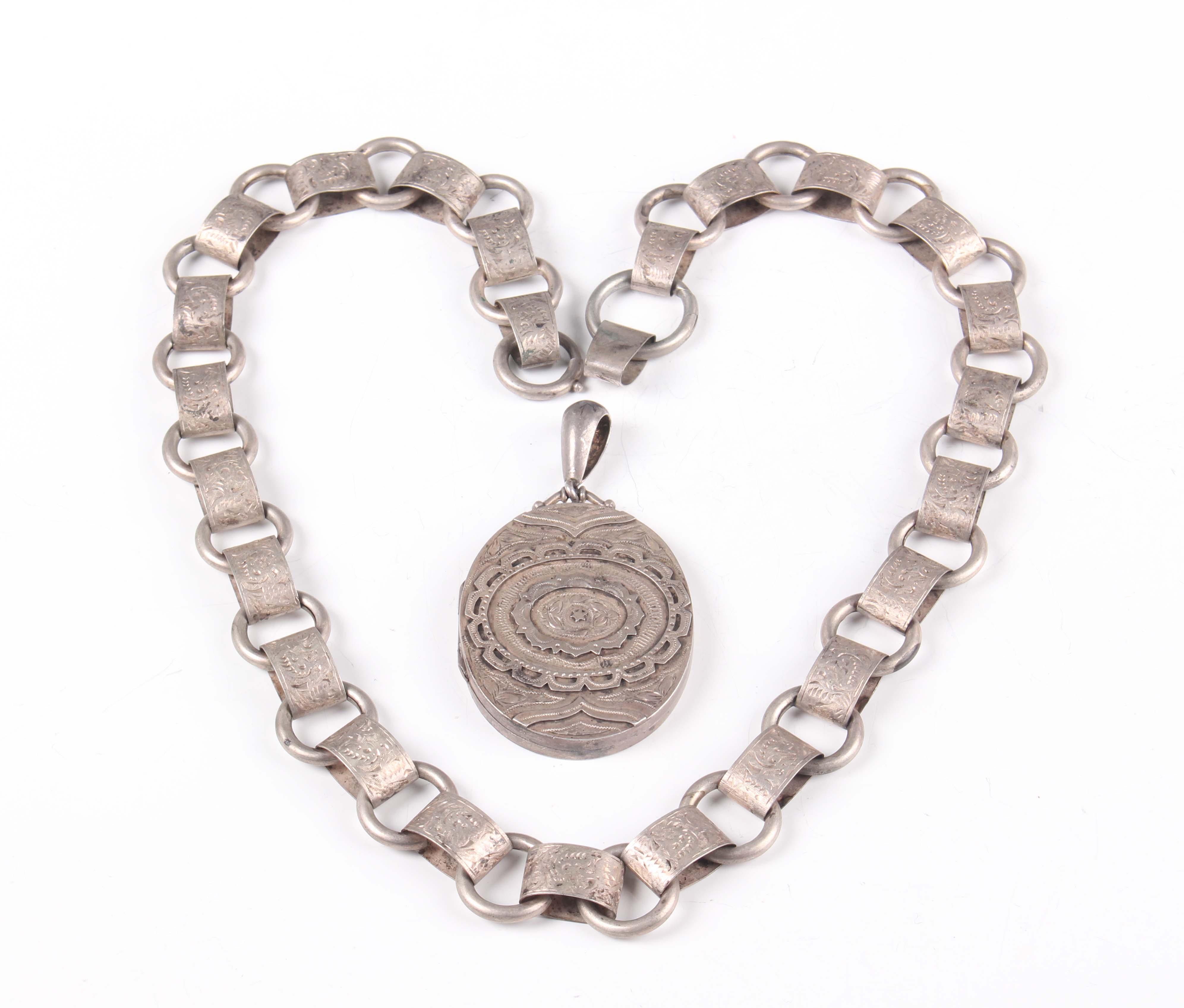 A Victorian silver oval pendant locket, Birmingham 1883, length 6.2cm, with an oval and circular link collar necklace with engraved decoration, length 49cm, total weight 52.3g.