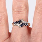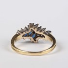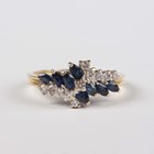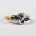 An 18ct gold, sapphire and diamond ring, claw set with eight marquise shaped sapphires and eleven circular cut diamonds in a crossover design, weight 3.6g, ring size approx N1/2.