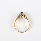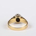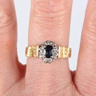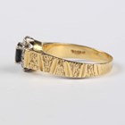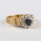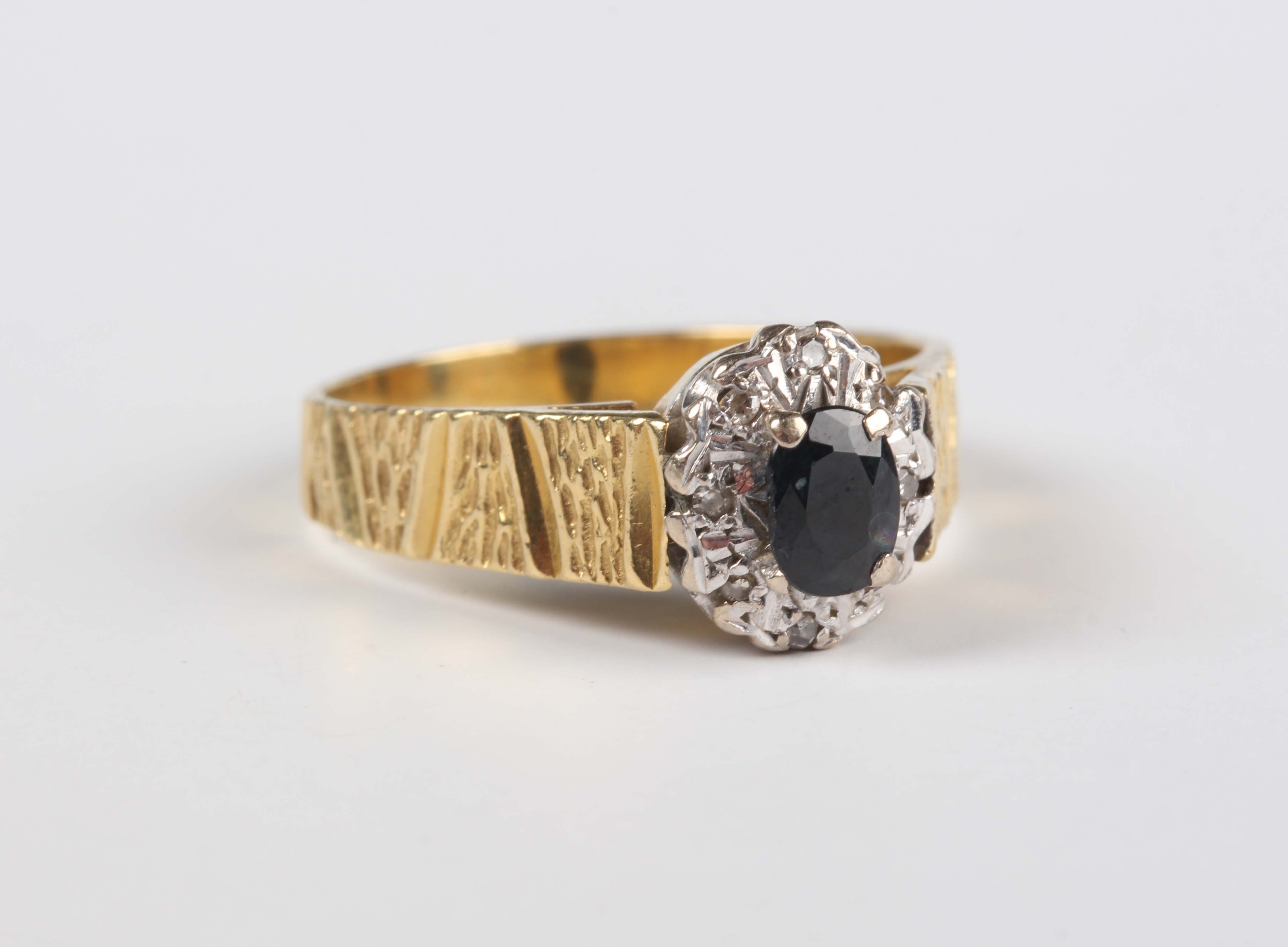 An 18ct gold, sapphire and diamond cluster ring, claw set with the oval cut sapphire at the centre between textured shoulders, London 1978, weight 5.3g, ring size approx Q.