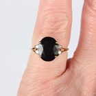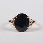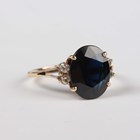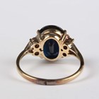 A gold ring, claw set with an oval cut sapphire between two circular cut diamonds, indistinct mark, weight 2.6g, ring size approx I.