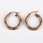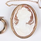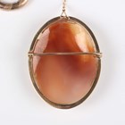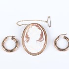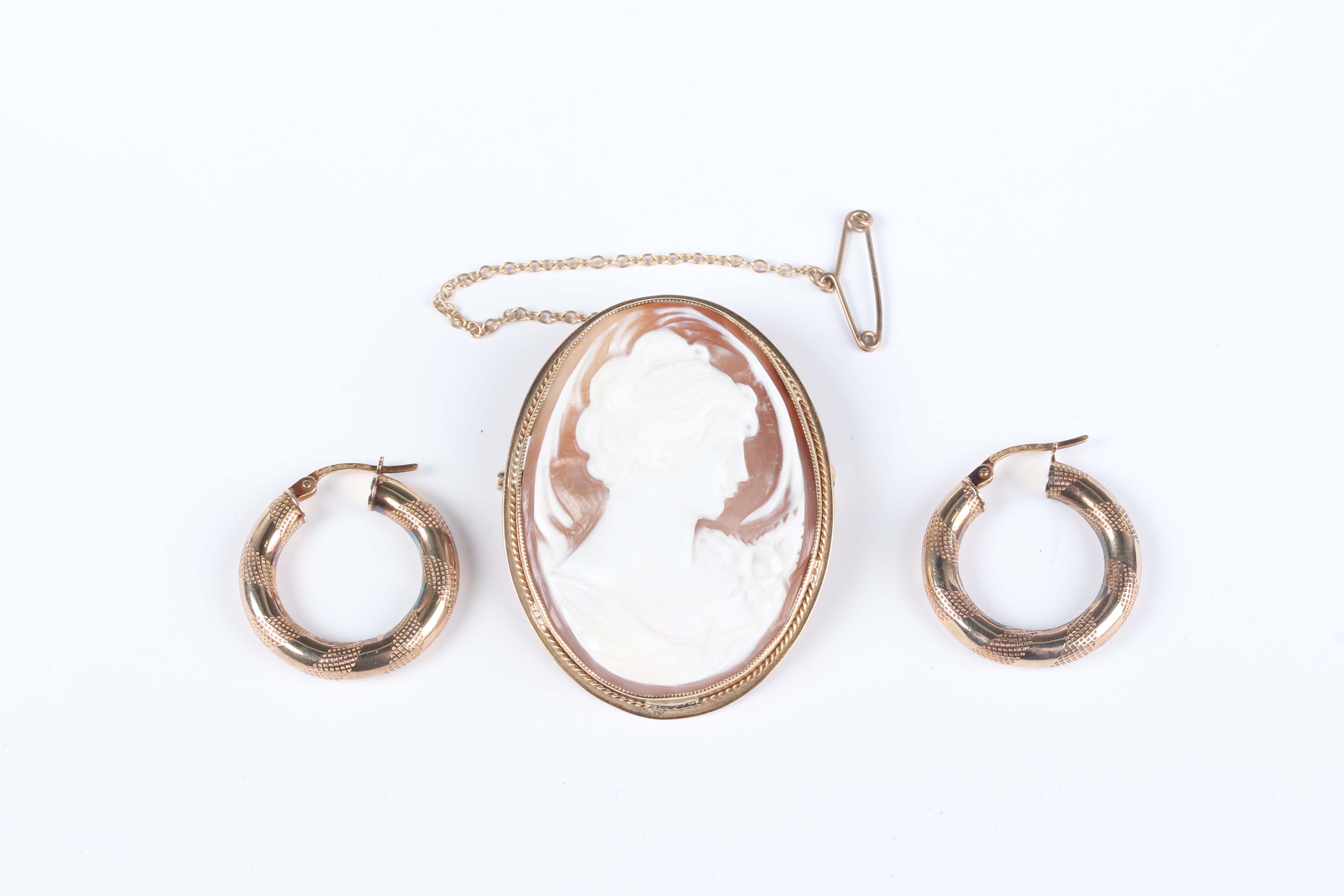 A 9ct gold mounted oval shell cameo brooch, carved as a portrait of a lady, Birmingham 1979, width 3.4cm, and a pair of gold hoop shaped earrings, detailed ‘375’, length 2.3cm, total weight 12.5g.