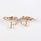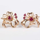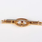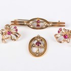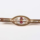 A gold, garnet and seed pearl bar brooch, detailed ‘9ct’, width 4.6cm, a gold, garnet and seed pearl oval pendant, detailed ‘9ct’, length 2.2cm, and a pair of 9ct gold and synthetic ruby earrings with screw fittings, detailed ‘9ct’, Birmingham 1960, length 1.8cm, total weight 7.3g.