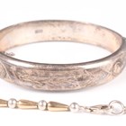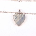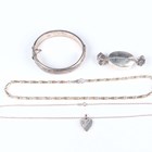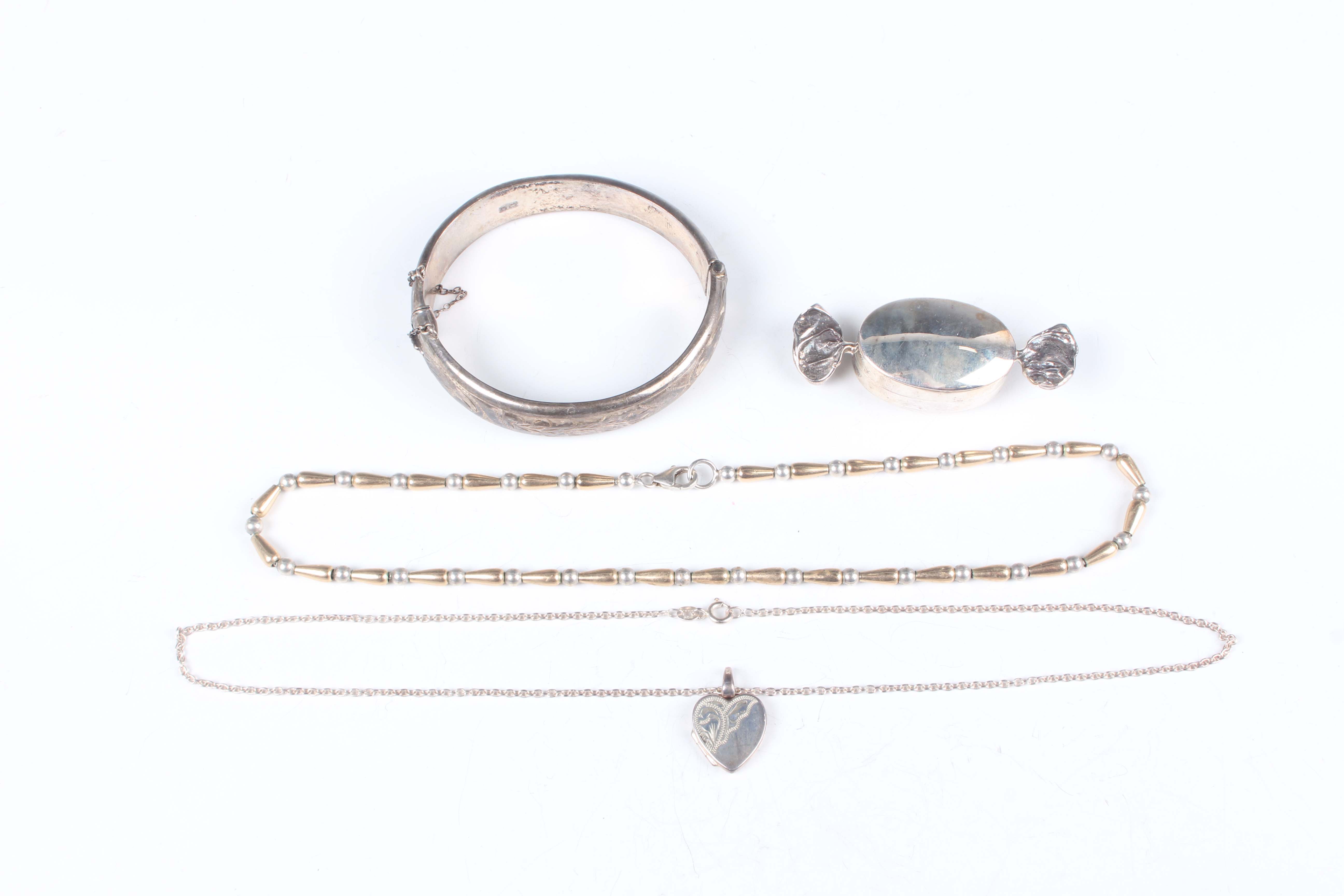A small group of silver jewellery, comprising an oval hinged bangle with engraved decoration, Birmingham 1964, inside width 6.1cm, a trinket box, designed as a wrapped sweet, unmarked, a silver and silver gilt necklace, detailed ‘925’, and a heart shaped locket with neckchain, total weight 48.9g.