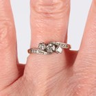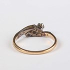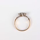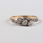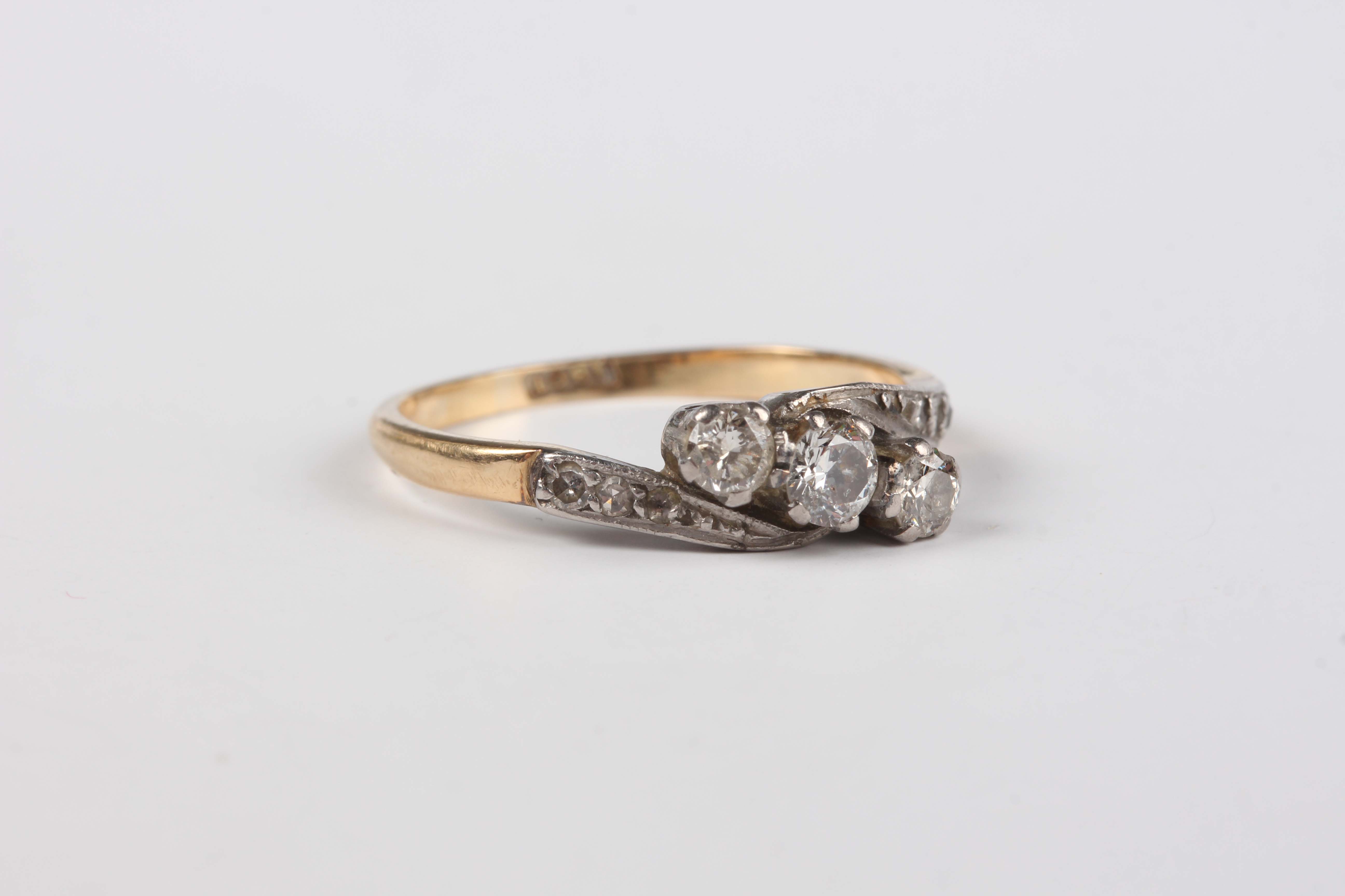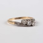A gold and diamond ring, claw set with the three principal old cut cushion shaped diamonds between diamond three stone shoulders, detailed ‘18ct’, weight 2.8g, ring size approx N1/2.