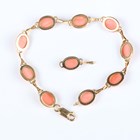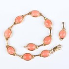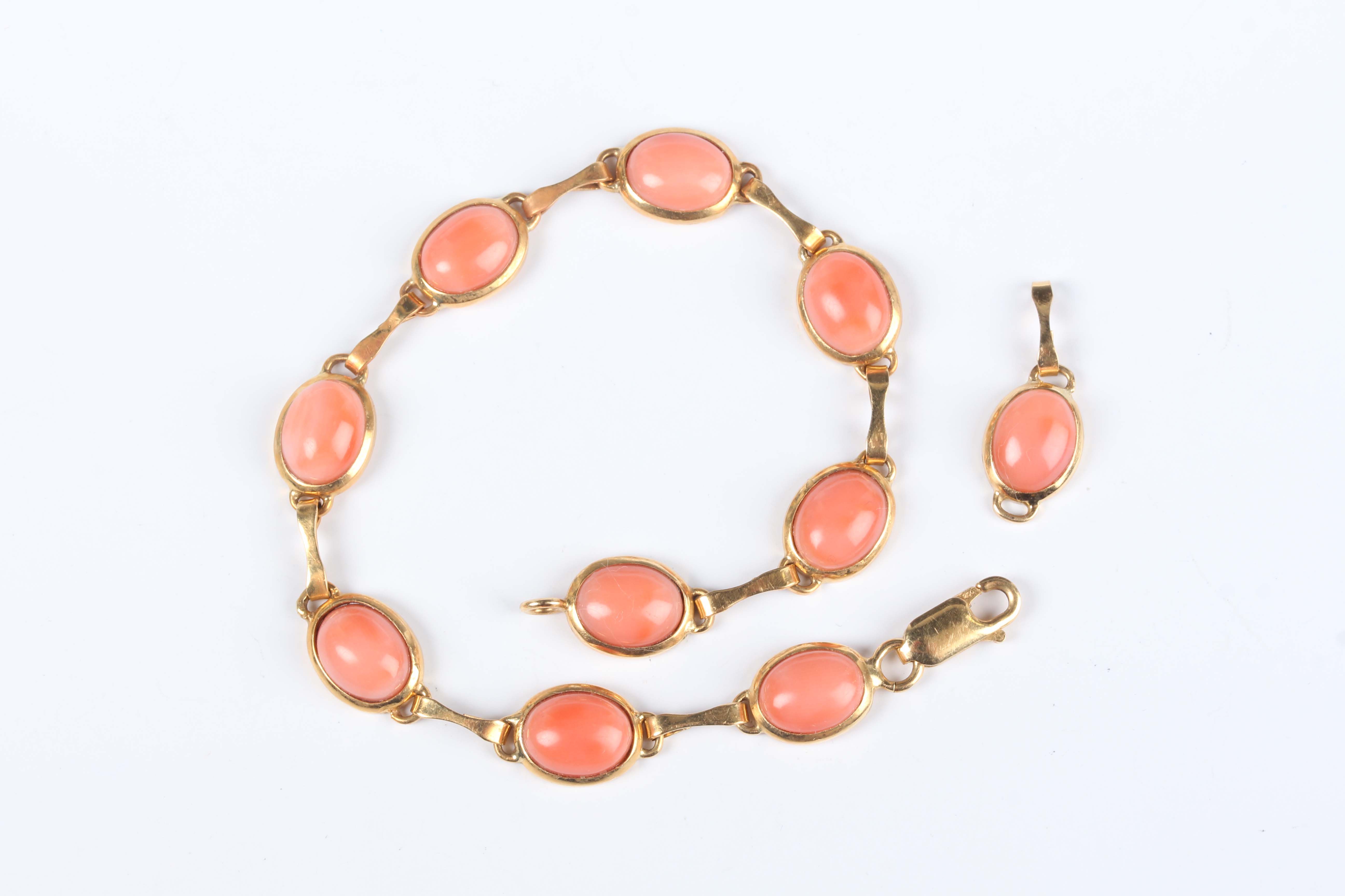 A gold and oval coral link bracelet on a sprung hook shaped clasp, detailed ‘750’, length 19.2cm, with a spare link, total weight 12.9g, with a case.