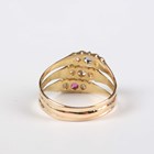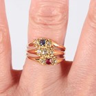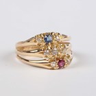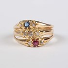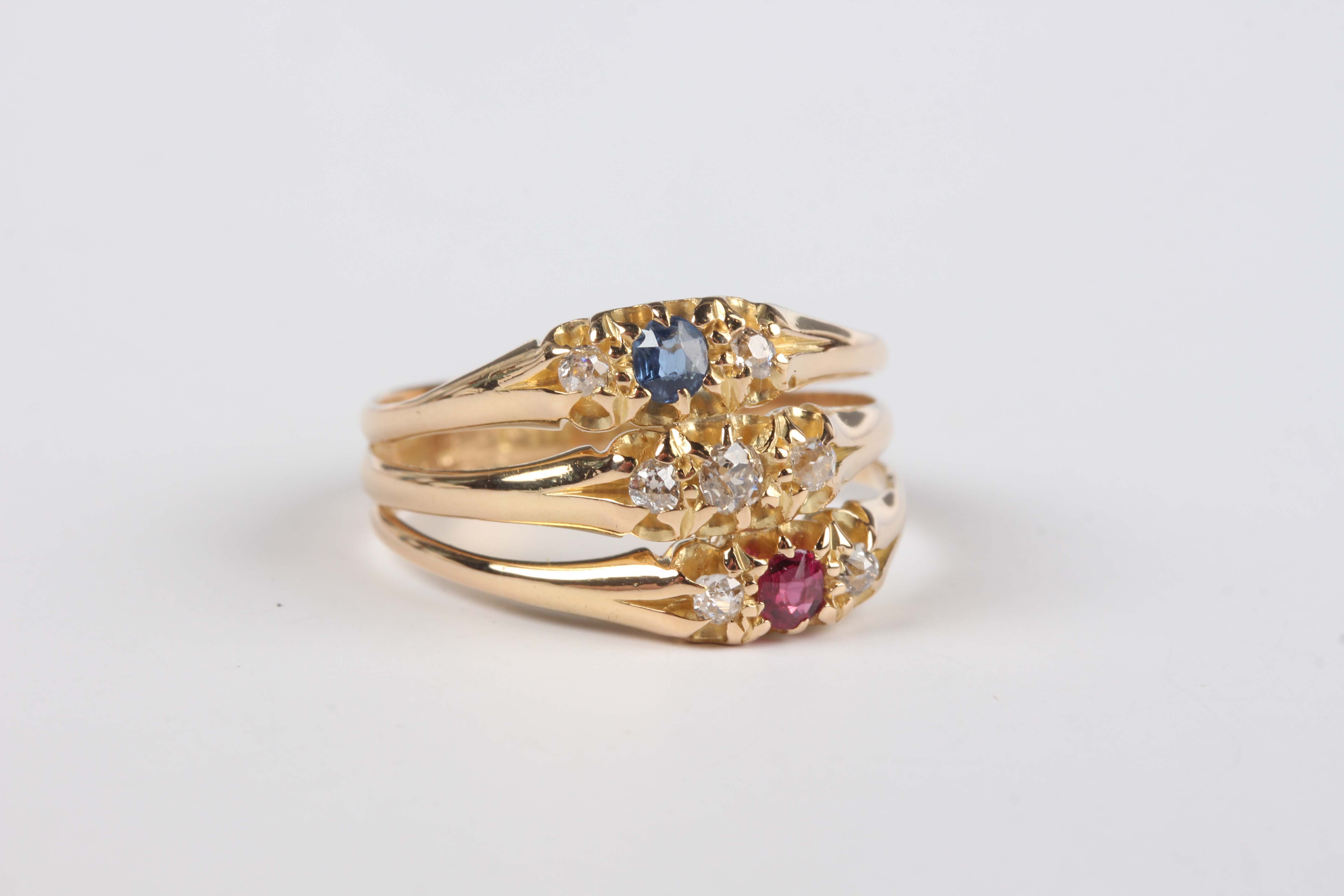 An 18ct gold, diamond, ruby and sapphire ring in a triple hoop design, mounted with seven cushion shaped diamonds, one cushion shaped ruby and one cushion shaped sapphire, Birmingham 1918, weight 4g, ring size approx O.