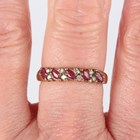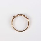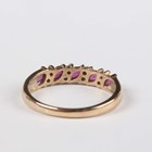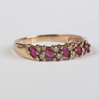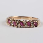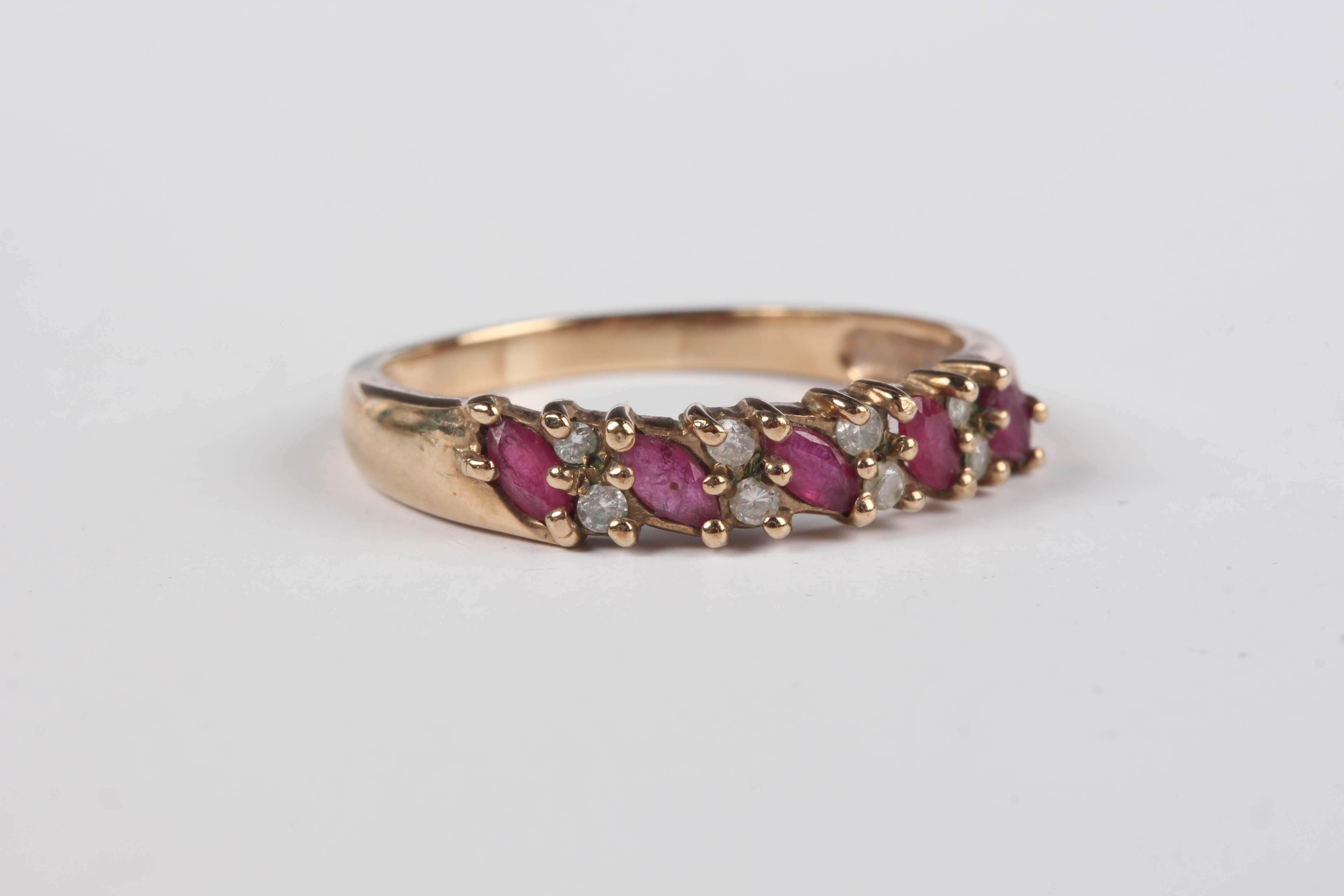 A 9ct gold, ruby and diamond half hoop ring, claw set with five marquise shaped rubies, alternating with four pairs of circular cut diamonds in a slanting design, weight 2.3g, ring size approx P.