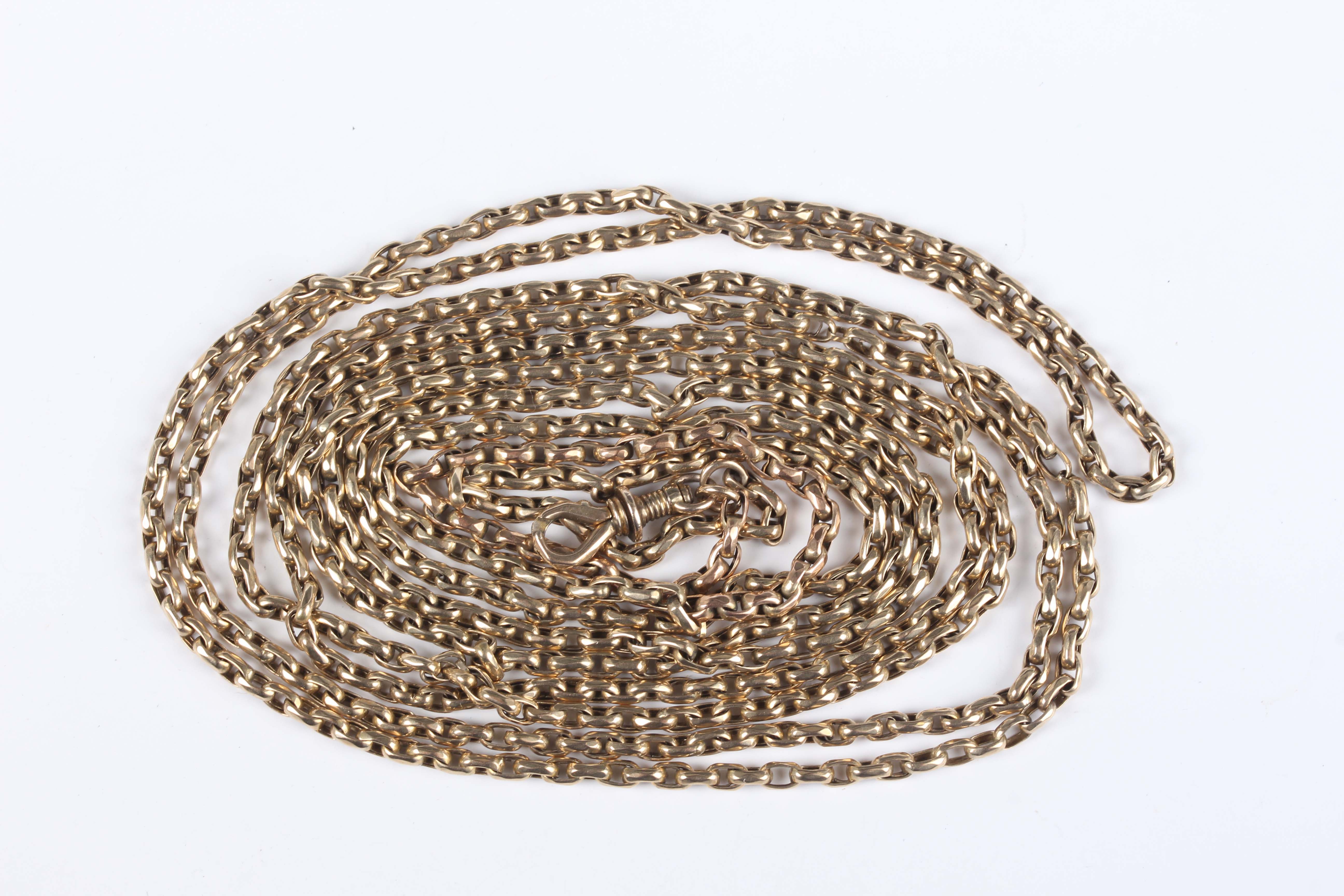A gold oval link long guard chain, unmarked, fitted with a swivel, unmarked, weight 25.4g, length 151cm.