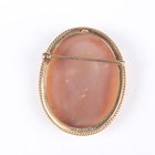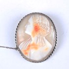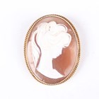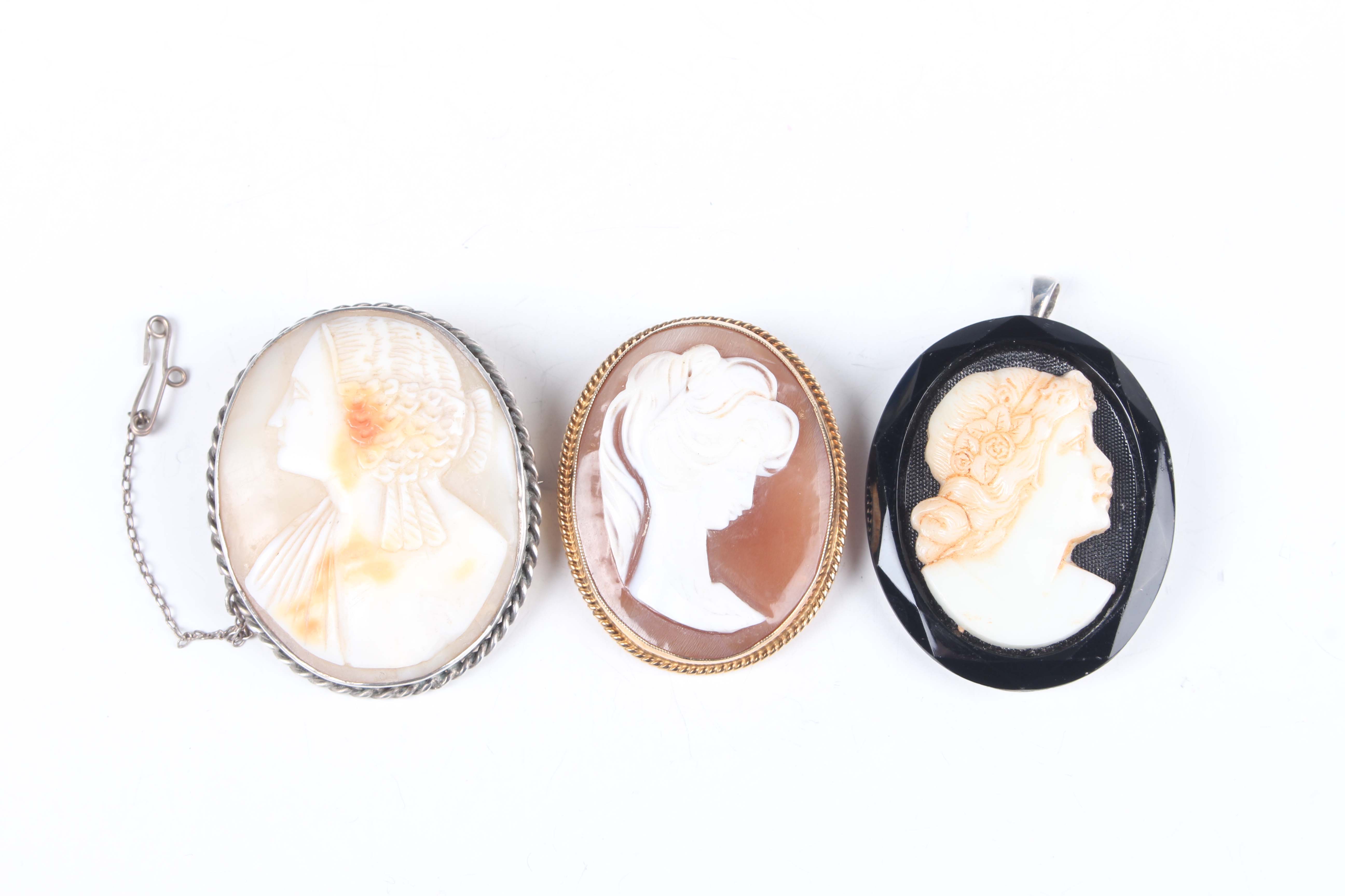 A 9ct gold mounted oval shell cameo brooch, carved as a portrait of a girl, Birmingham 1975, weight 12.6g, width 3.4cm, an oval shell cameo brooch and a moulded paste cameo pendant brooch.