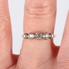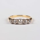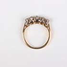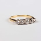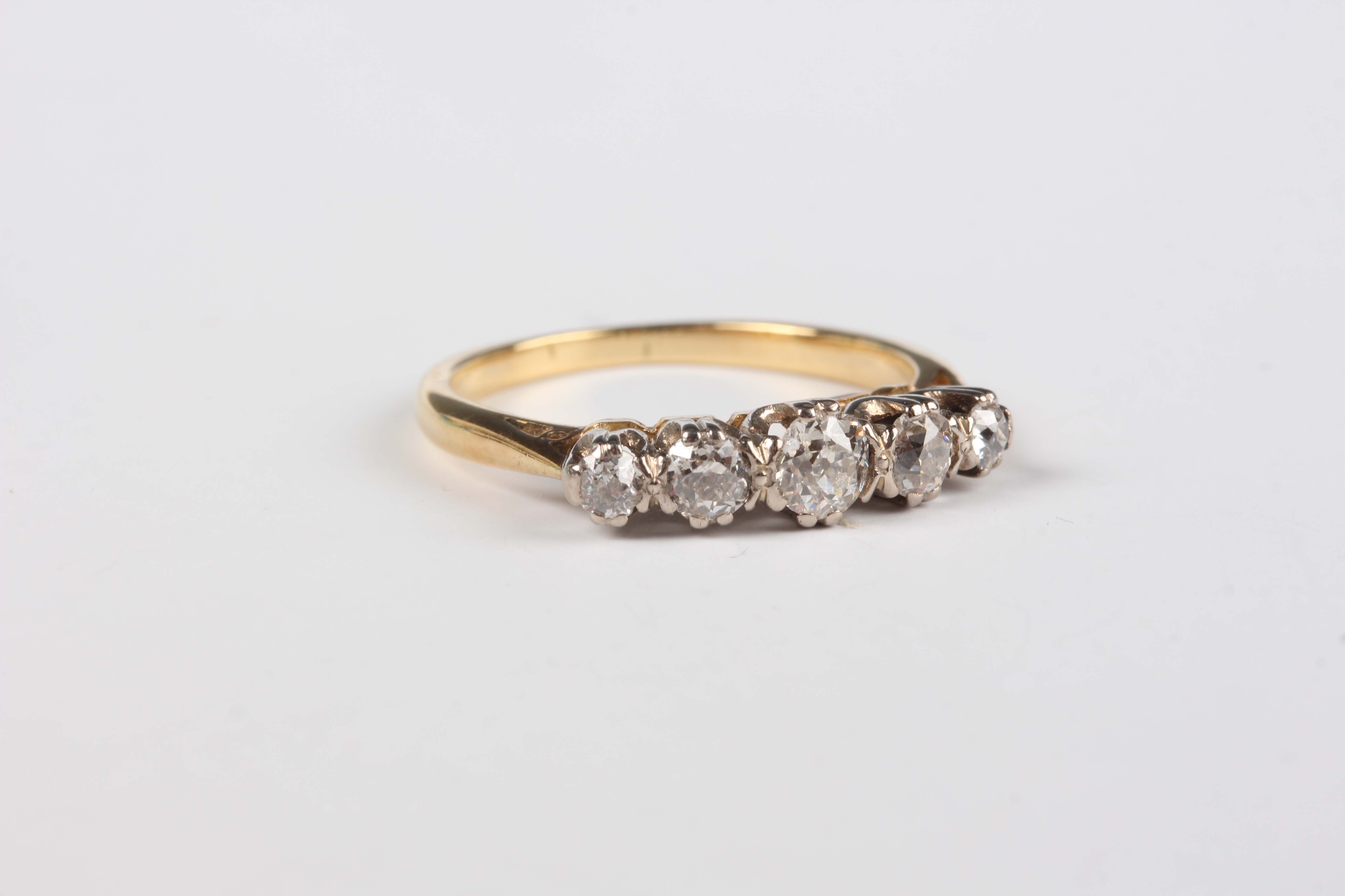 A gold and diamond five stone ring, mounted with a row of graduated cushion shaped diamonds, unmarked, weight 3.3g, ring size approx K1/2.