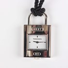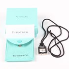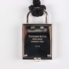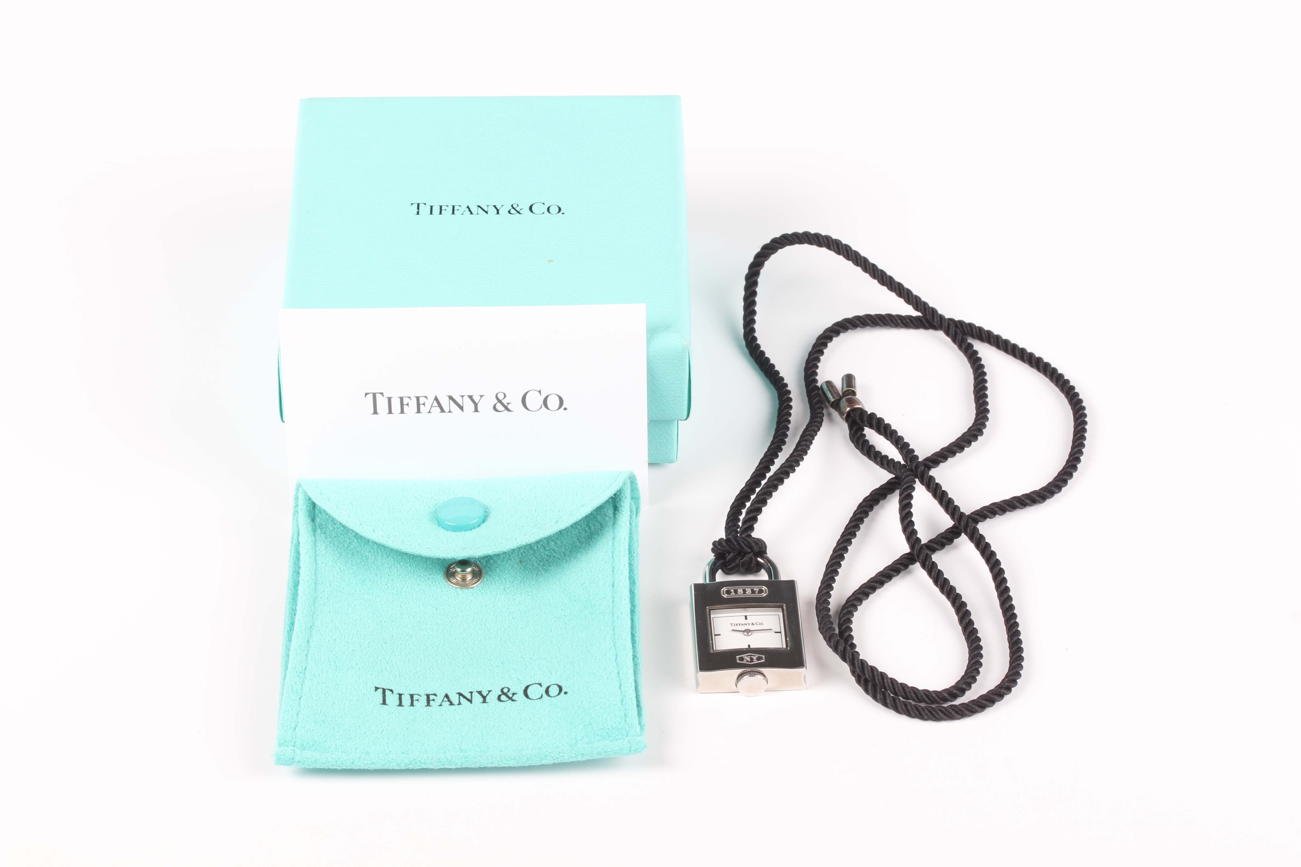 A Tiffany & Co steel cased padlock shaped pendant quartz watch, length 3.5cm, fitted to a black cord necklace, with pouch and box.