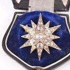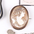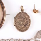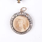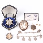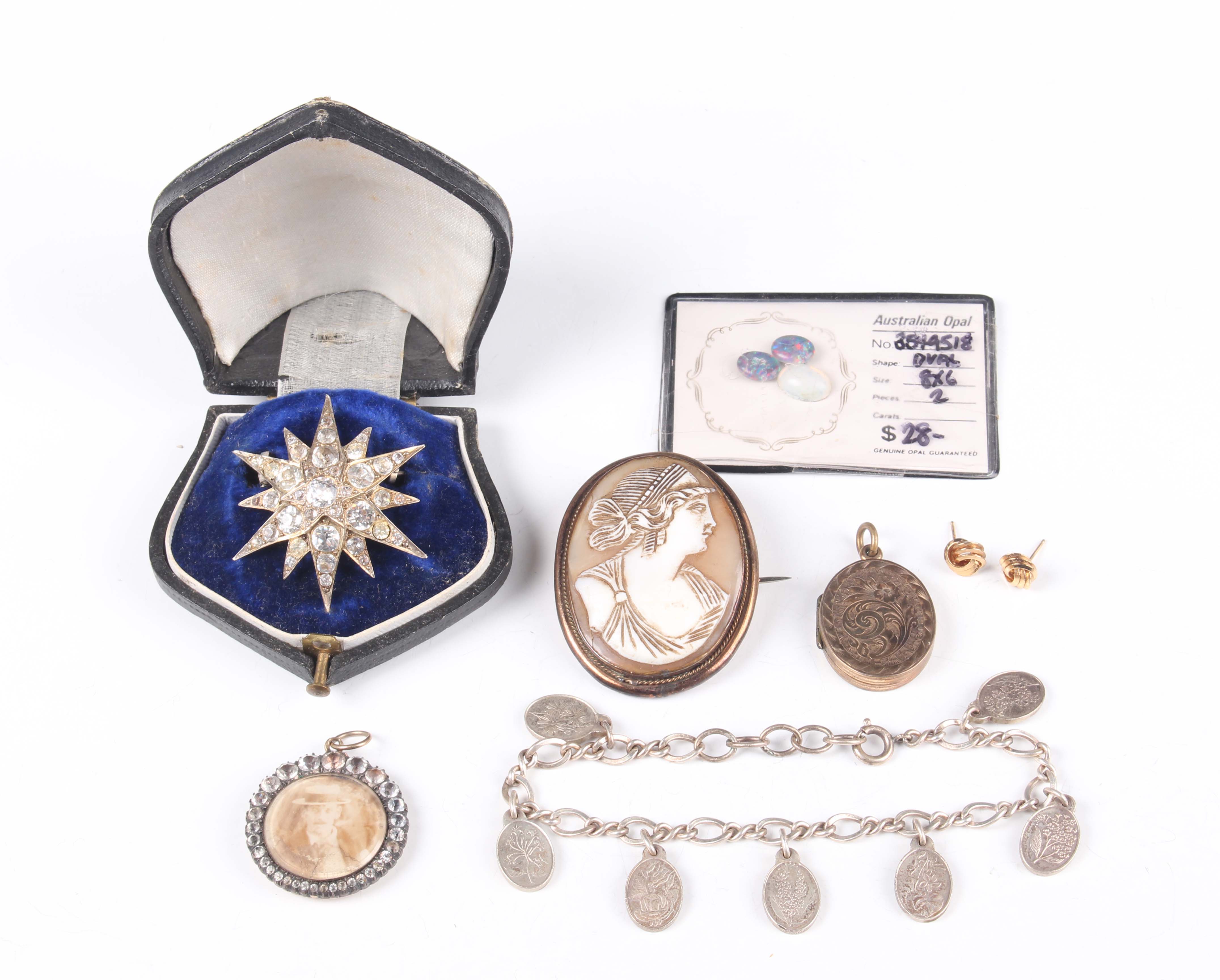 A small group of Victorian and later jewellery, including a silver and colourless paste set starburst brooch, unmarked, width 3.3cm, with a case, a gold backed, silver and colourless paste set circular pendant, the front glazed with a locket compartment, an oval shell cameo brooch, carved as a portrait of a lady, and a gilt metal oval pendant locket.